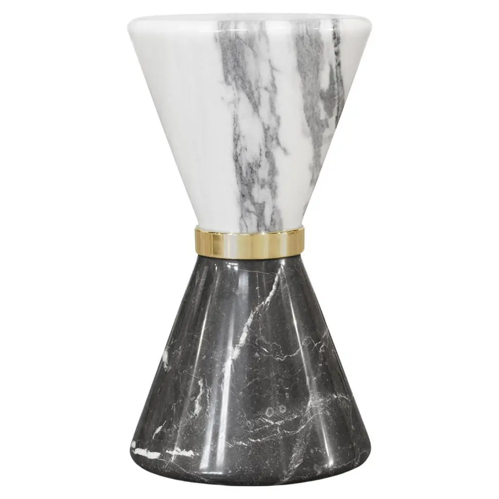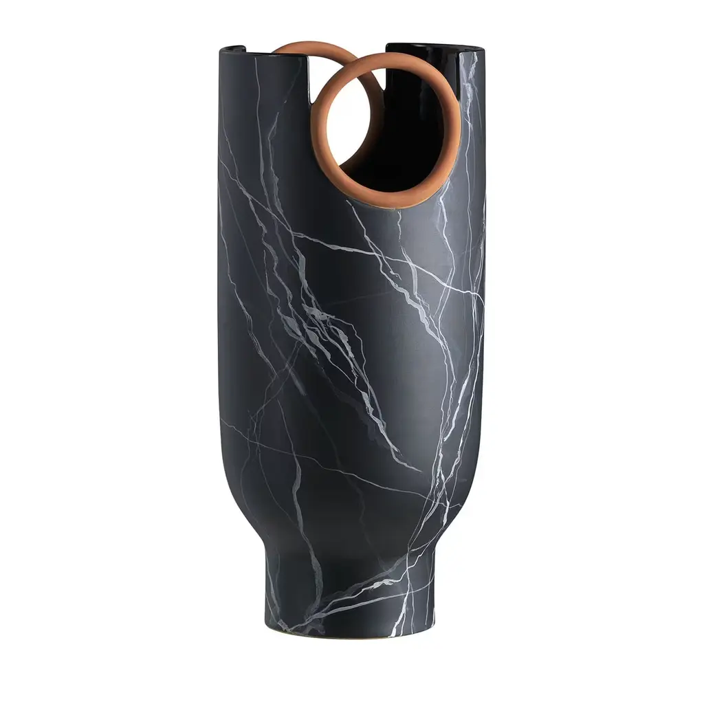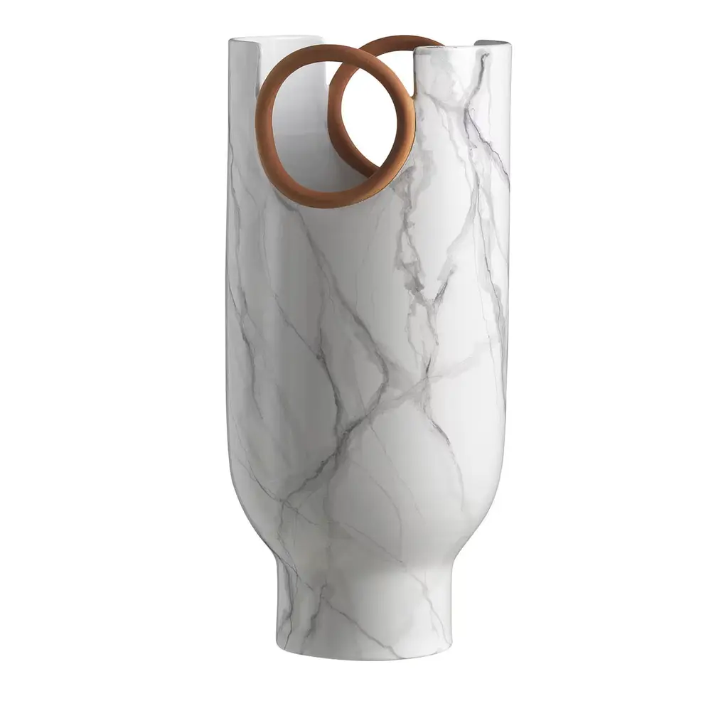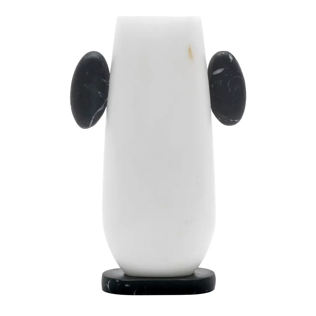 Inspired by the elongated shapes and graceful profiles marking Amedeo Modigliani's subjects, this sculptural vase merging white Michelangelo and red Levanto marbles will make for a delightful addition to any contemporary decor. Its anthropomorphic design is comprised of an elongated base, two side oval elements evoking stylized ears, and a stripe in black Marquina marble represents the mouth. This one-off piece is not watertight. Please note that marbles and stones are natural materials and they can differ also if coming from the same quarry or the same block. The product shown may differ from purchased items. Every piece is unique. Vases made of various marbles cannot guarantee water tightness, better not to use for cut flowers unless with vials for each flower, an internal glass/plastic jar or gel water pearls. Please read carefully the unpacking and handling instructions.