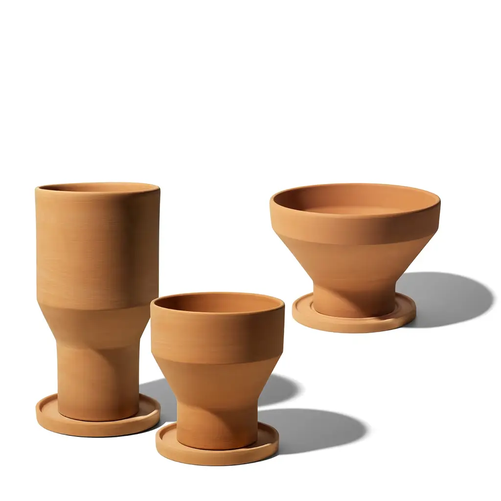 Designed having archetypal garden planters in mind, this set comprised of a stackable vase and coordinated plant saucer is handcrafted of terracotta offered in its superb natural finish. The coexistence of geometric inspiration and artisan flair make this warm set a solution of timeless elegance to complement any style of decor.
