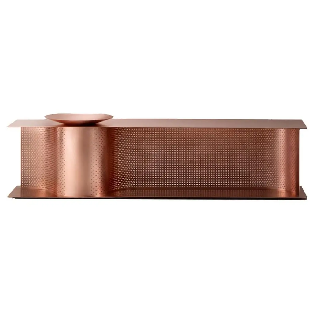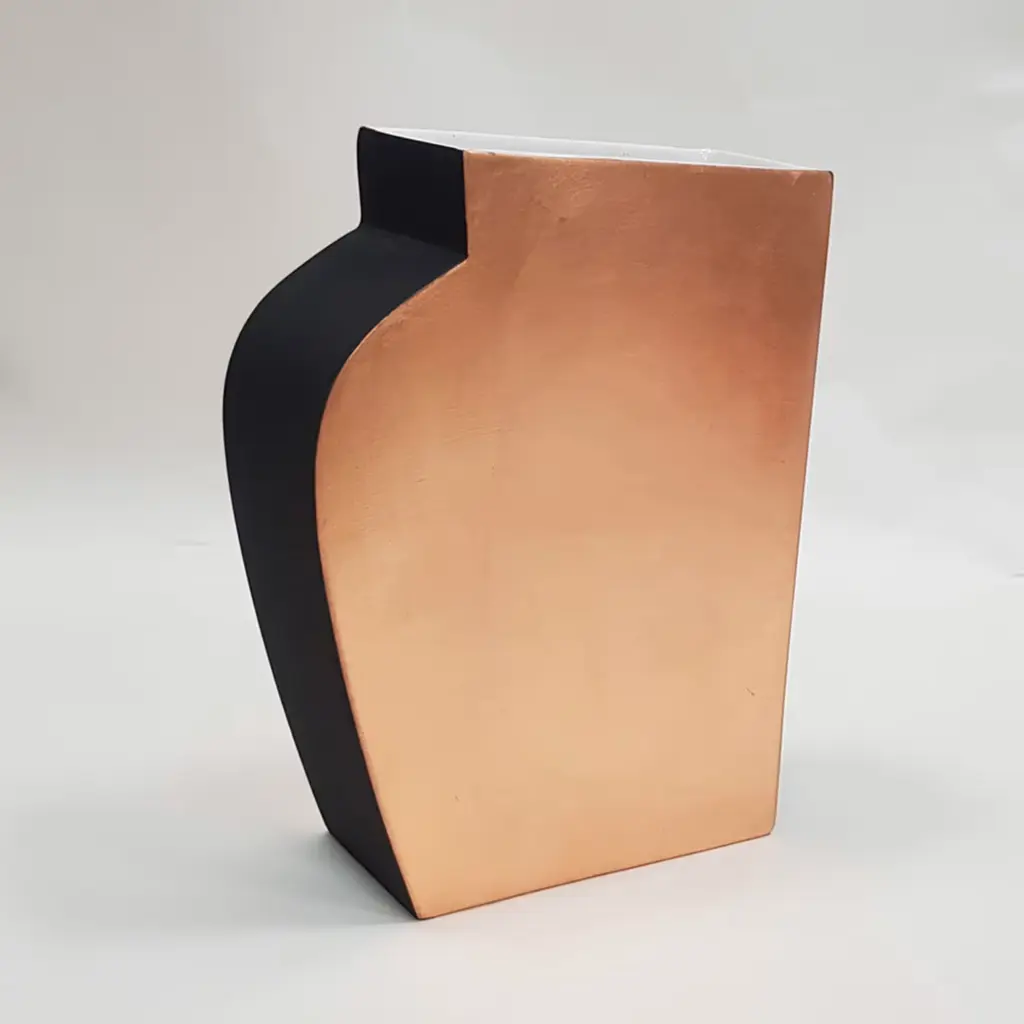 This exquisite copper pink and dark vase is part of the Pacay series and features a narrow body, sinuous profile, and a color block decoration that, in this case, is enriched by the use of hand-applied gold leaf. Alone, or along with other vases from the same series, this piece adds a sophisticated light to any decor.