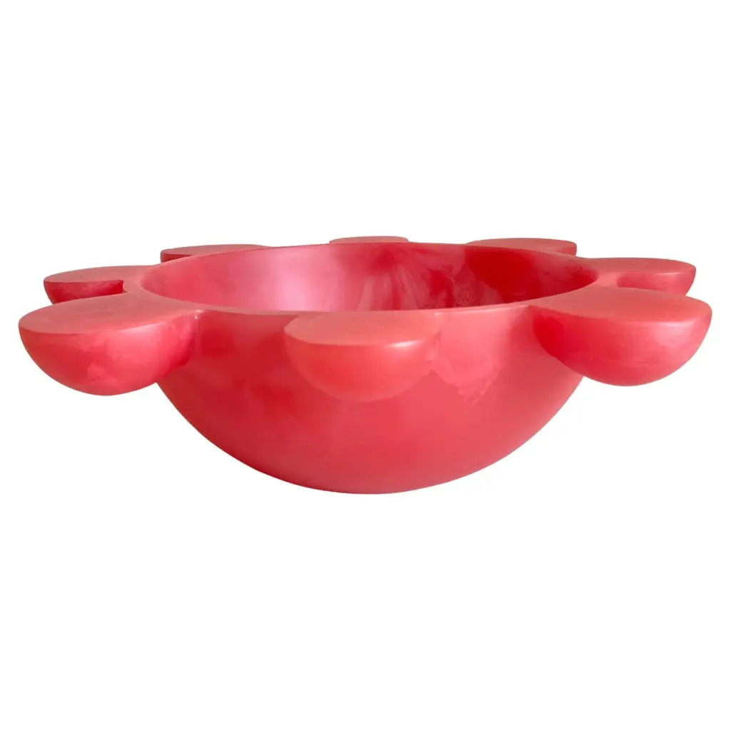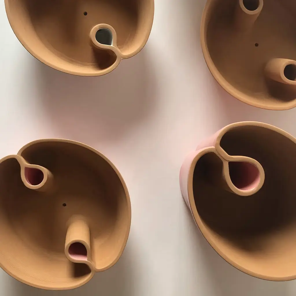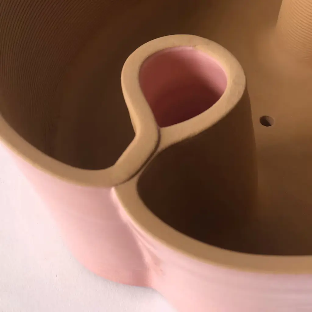 Red clay plant pot, printed with 3D technology. The lines describe a silhouette with flared walls and two drop-shaped tubular elements, glazed in glossy pink, for water collection that are activated by the porosity of the clay.