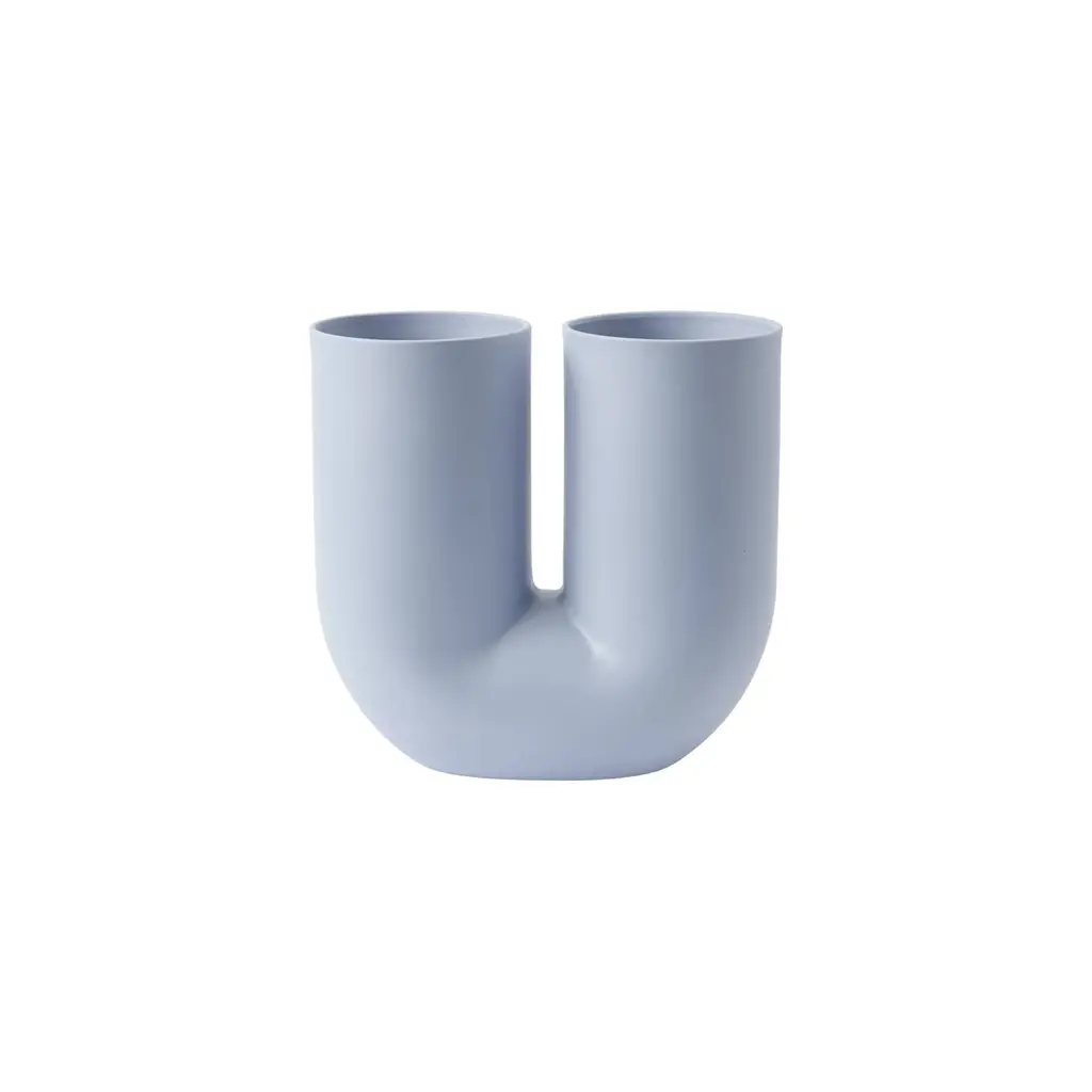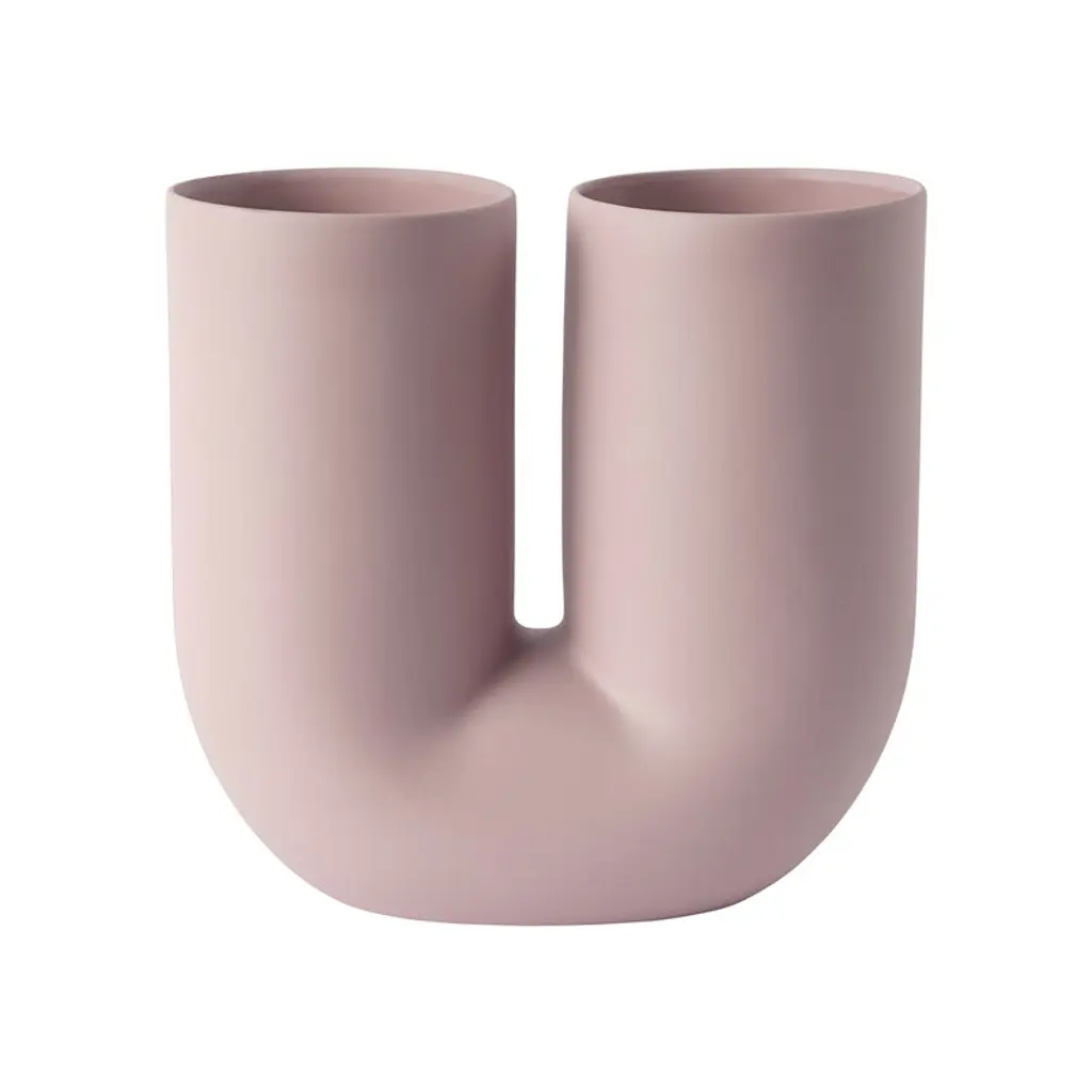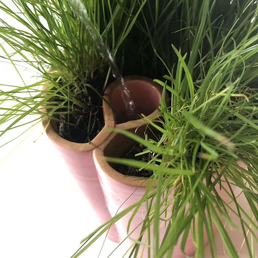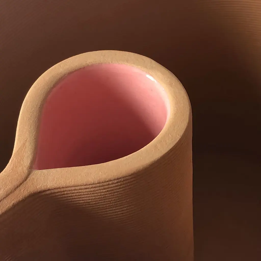 Red clay plant pot, printed with 3D technology. The lines describe a silhouette with flared walls and a central tubular teardrop-shaped element, glazed in glossy pink, for collecting water that is activated by the porosity of the clay.