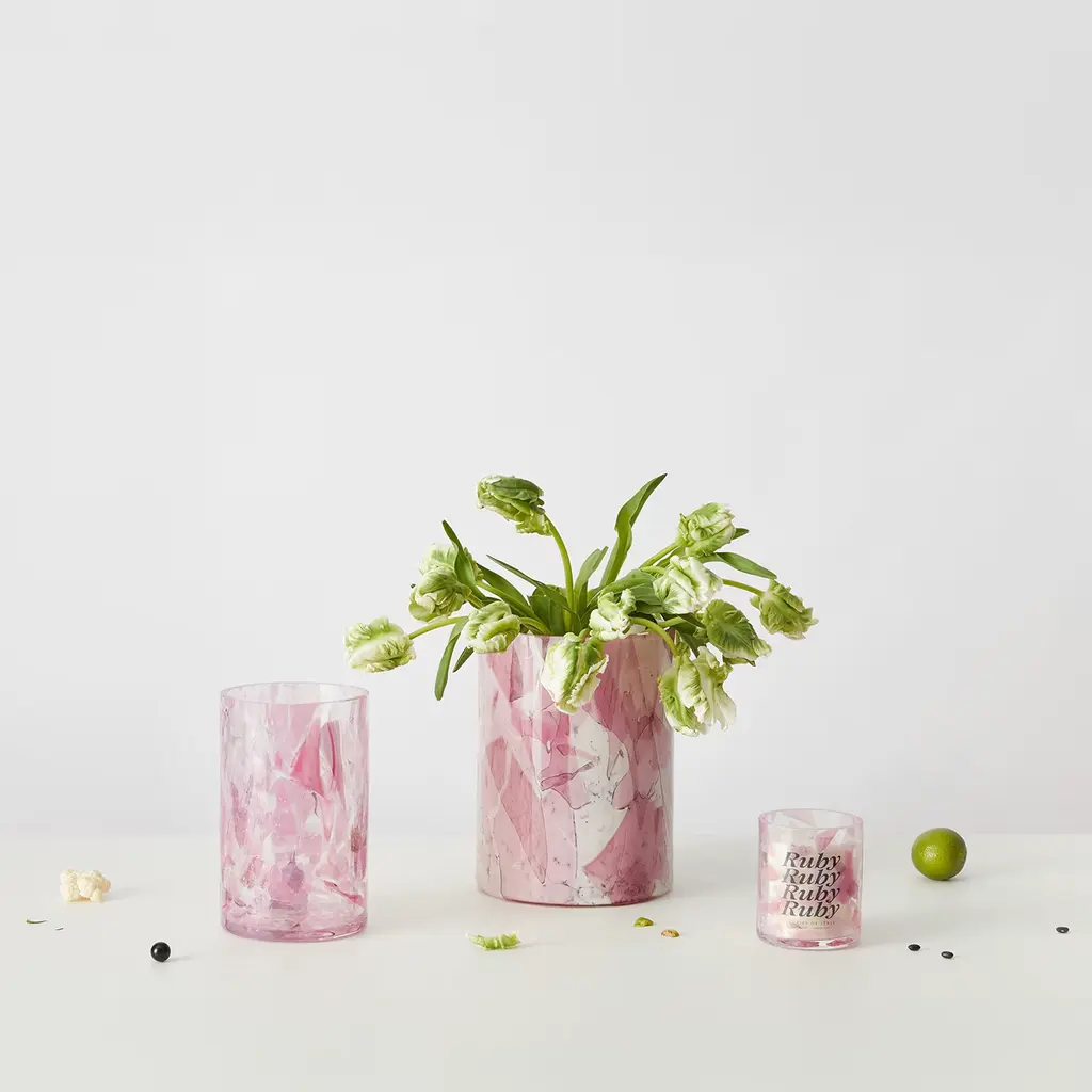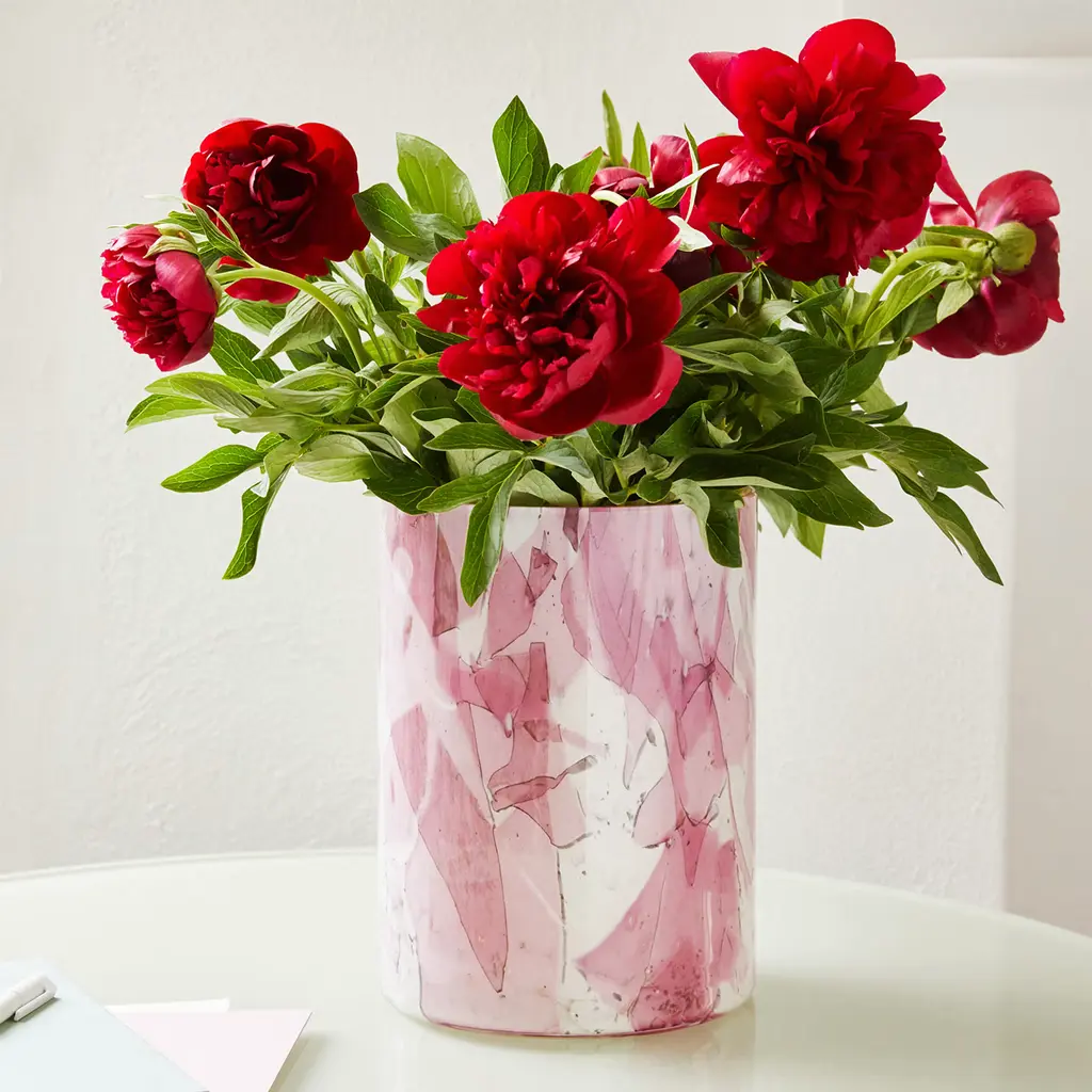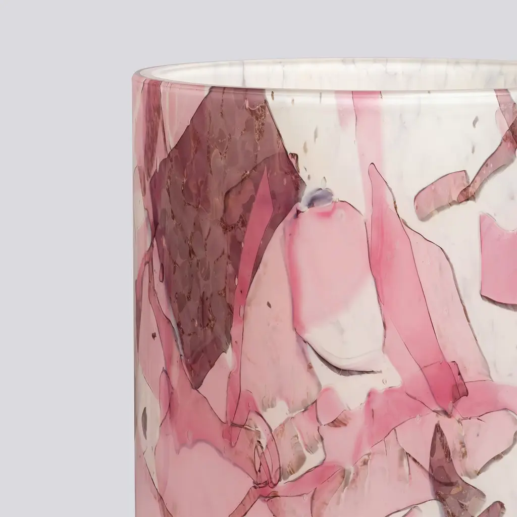 The Large Vase, crafted from Murano blown glass in Venice, features the distinctive Nougat technique. Pink hue glass shards melt onto an ivory base, creating a dynamic fusion of ever-changing hues. With its classic proportions, this vase is perfect for large floral arrangements or as a stunning centerpiece. Mouth-blown and handcrafted, each unique piece showcases the elegance and timeless beauty of Italian craftsmanship, adding sophistication and artistry to any space.