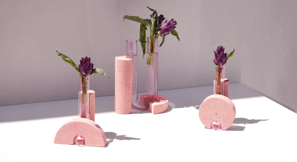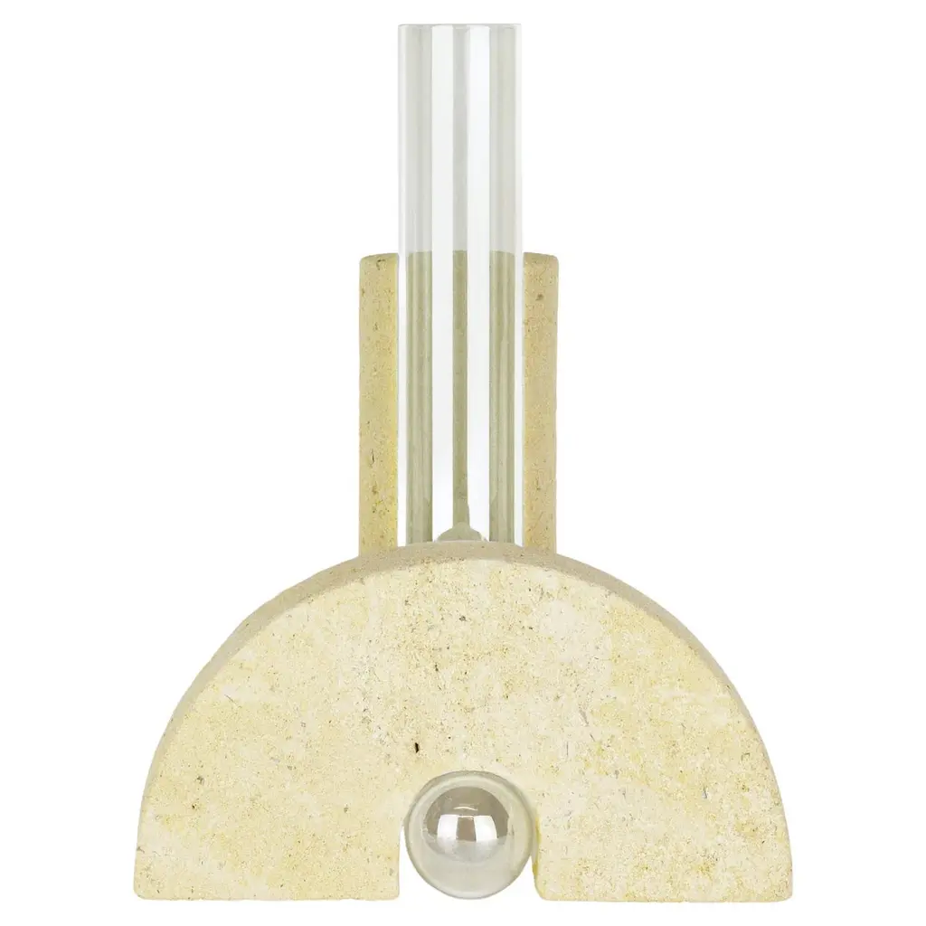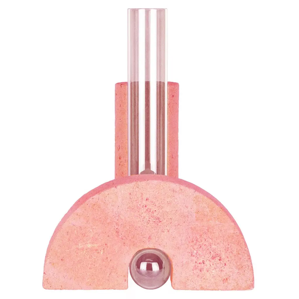 Pink-Pink Cochlea della Metamorfosi 1 Soils Edition Vase by Coki Barbieri.Dimensions: W 18,5 x D 15 x H 24 cm.Materials: Handcrafted stone made with Matera stone fragments, sedimentary rocks of the Italian Apennines and pure water, pink mineral pigments from Italian soils, pink painted borosilicate glass.Cochleae vases collection is inspired by the life cycle of the snails and captures their growth when the invertebrate's body (represented by the curved glass) develops upwards from the embracing shell symbolized by semicircular shells handcrafted from fragments of historical stones only found in Matera (Città dei Sassi, UNESCO World Heritage, European Capital of Culture), recovered and reprocessed following a sustainable production cycle. The surface of the handcrafted stone piece is treated with an ecological substance developed by COKI. The glass and stone components are not glued and can be separated, disassembled, and ready for new uses.Soils edition is made with colored pigments of Italian soil.A precious objects collection made in Italy with natural and vegan origin materials, conceived by architectural and product designer Coki Barbieri and created by the local craftsmen to expand a new slow living awareness and surround oneself with a few objects, capable of staying alongside us over time.The climate emergency and increased future anxiety push our work to imagine alternative ways of living, producing, and consuming. For that Coki Barbieri uses notions of geology, chemistry, and design culture to create new products (and materials) from fragments and waste from natural products (such as stone and minerals).Coki Barbieri established her eponymous studio-workshop in Rimini in 2017, bringing to life a sustainable way of conceiving the product design for home. Nature inspires her environmentally conscious creations, which are imbued with emotional energy while maintaining their aesthetic impact and practical functionality. Coki collaborates with talented Italian craftsmen to produce one-of-a-kind homeware objects capable of unlocking new synergies between concepts, materials, and use.