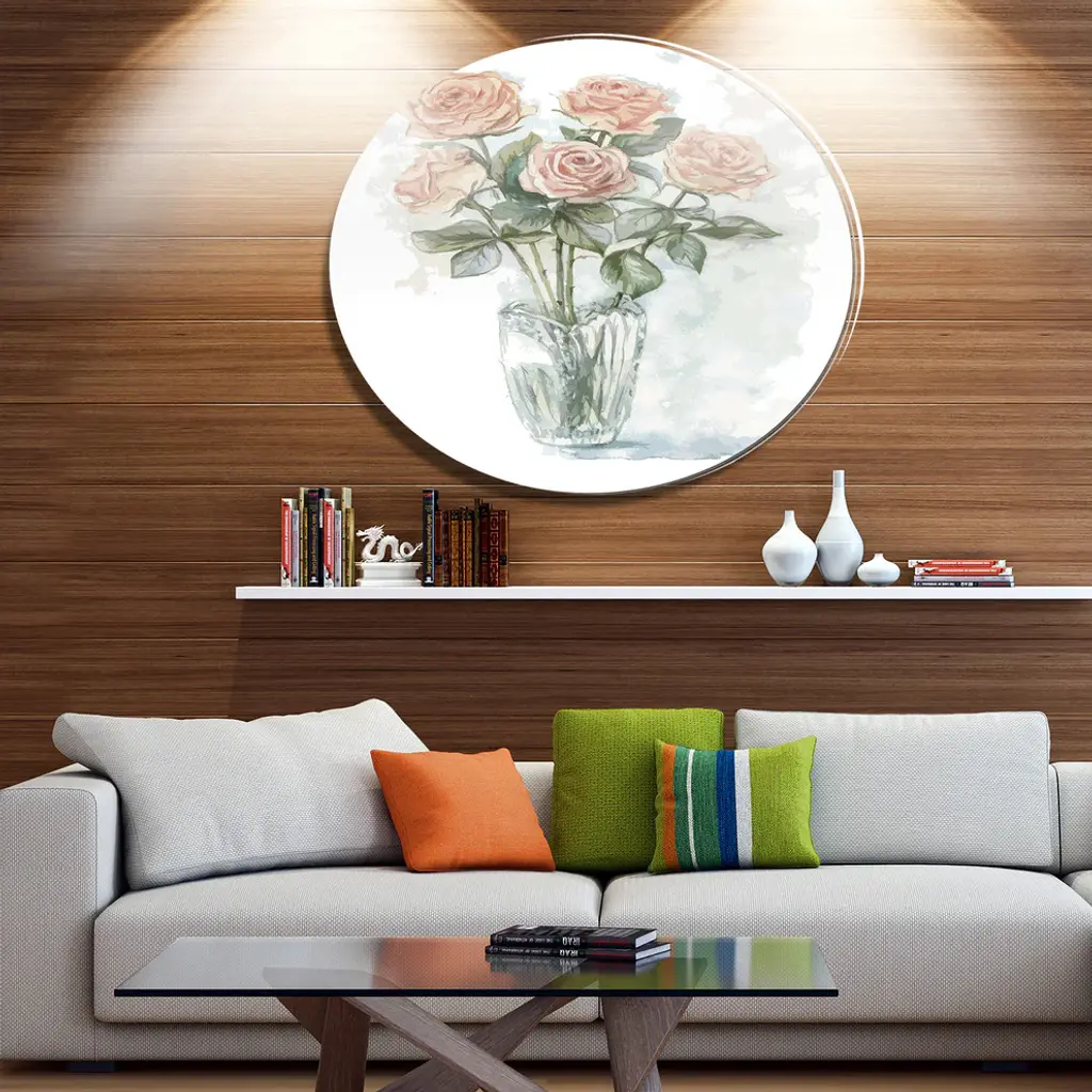 Bring Contemporary Abstraction to your home with this large Circle Metal wall art. This Pink Roses Bunch in the Vase Metal Artwork makes it the focal point of any room or office. - White Gloss Coating ensures colors are extra vibrant with light reflection.- Aluminum grade Sheet Metal with 1 inch mounting frame on the back giving the illusion that the artwork is floating on the wall..- Mounting Brackets are included along with instructions.- High Quality Digital images are created directly into a glossy aluminum panel producing a stunning and captivating print into the glossy finish of the metal.- Water, Fire and Scratch resistant HD Aluminum panels.- Looks better than any photo paper and guaranteed to last at least 20 years- Easy to clean with a microfiber cloth. Colors are far superior to regular Canvas Art. - Easy to Hang