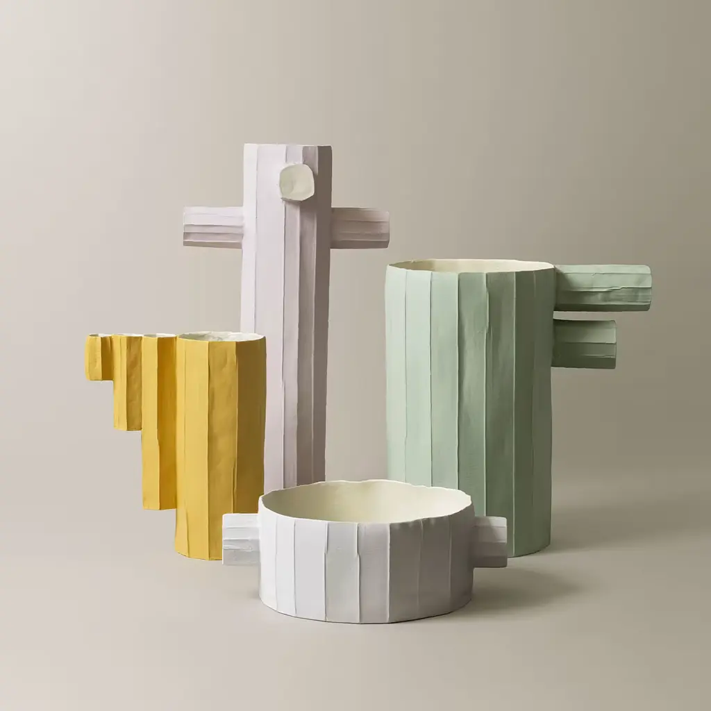 Part of Paola Paronetto's Cartocci family, the Pino Collection unveils distinguished vases that captivate with their singular forms. Whether tall, short, small, or large, each piece demands attention—some evoking the organic elegance of pruned tree branches, others resembling the whimsical allure of truncates noses. Crafted from pristine white paper clay interwoven with delicate yellow hues, this artwork, reminiscent of bamboo, beautifully echoes the serene beauty of the natural world.