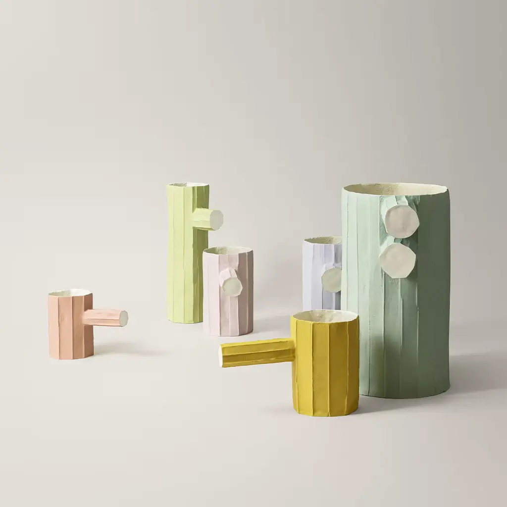 Characterized by its original design, this piece from the Pino Collection by Paola Paronetto is the latest addition to her celebrated Cartocci family. These distinctive vessels evoke the organic beauty of pruned branches or paired noses. Particularly striking is this piece featuring a singular branch that whimsically resembles a nose, like Pinocchio. Crafted from white paper clay interwoven with delicate yellow hues, it exudes creative finesse and invites dynamic compositions.