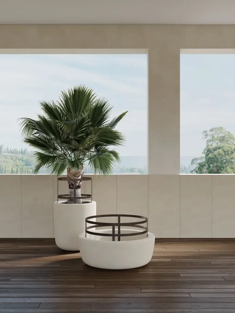 Piro is a vase in Piromafo stone and steel. The stainless steel structure (red iron or brown-grey), that acts as a container and support for the plants, is available in grey-brown and red. Available in two sizes. The Piro collection, consisting of a brazier, a convenient side table and a vase, is designed with the intent to create a micro environment around the fire. The central element of the collection is a hybrid object, performing the functions of brazier, flat top surface and seat.