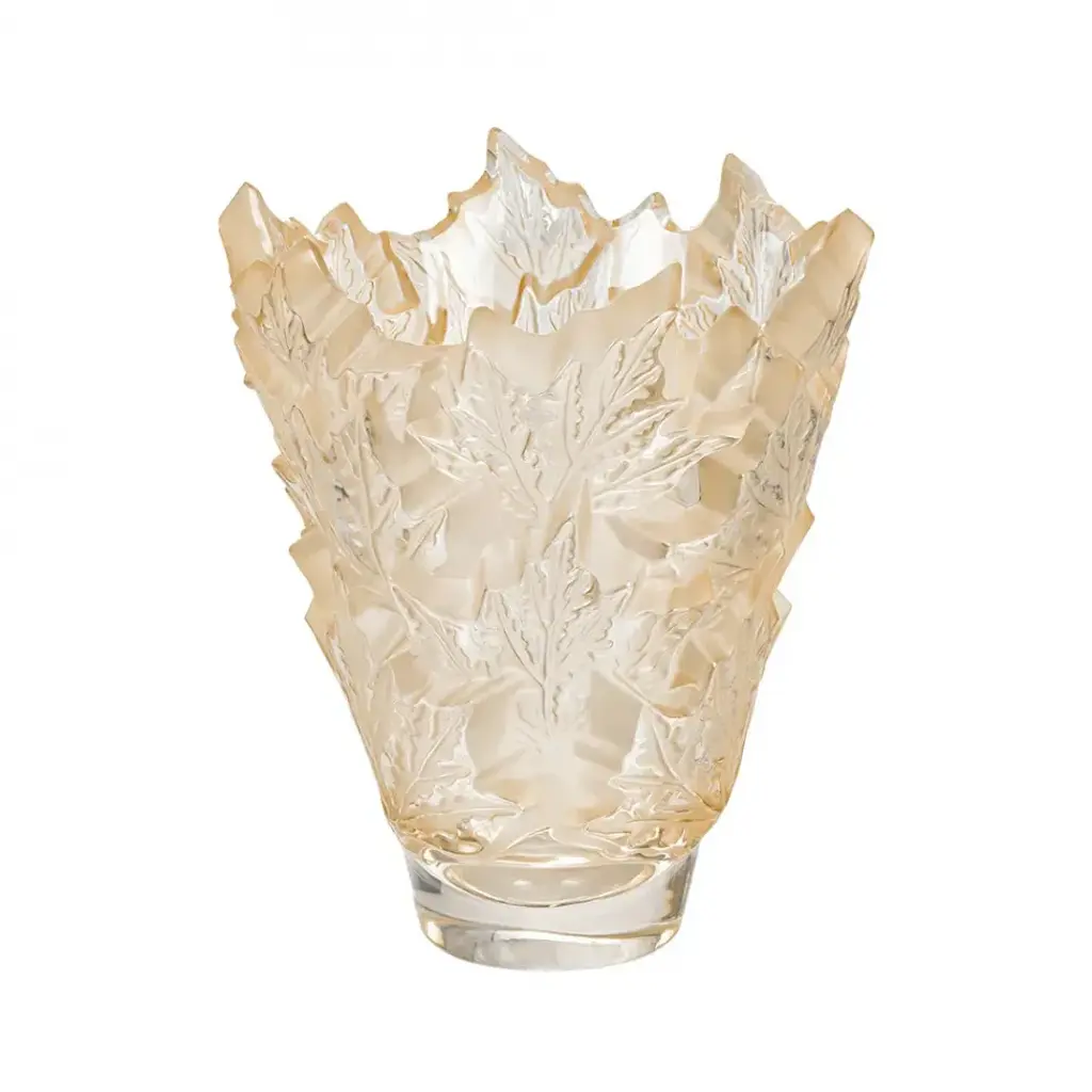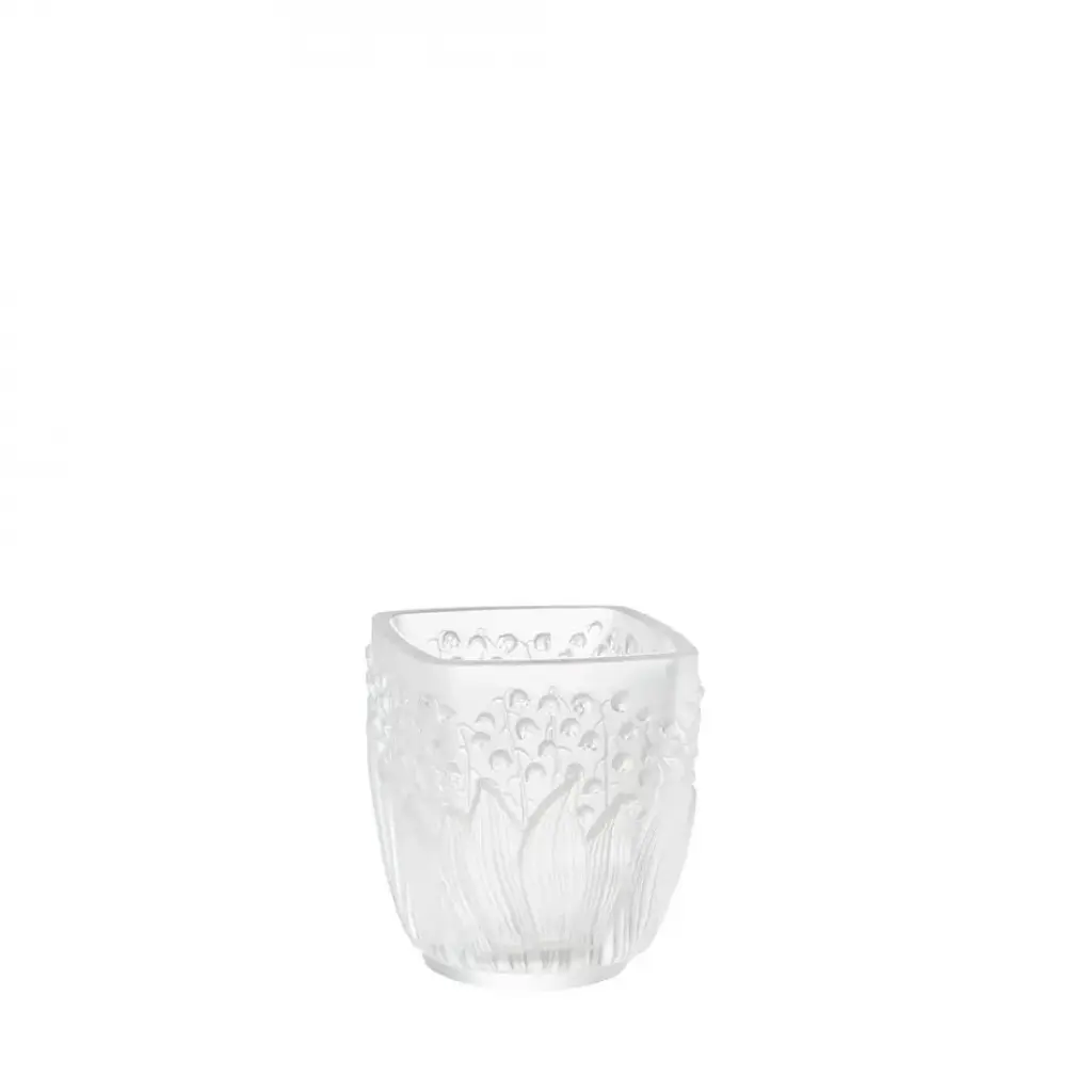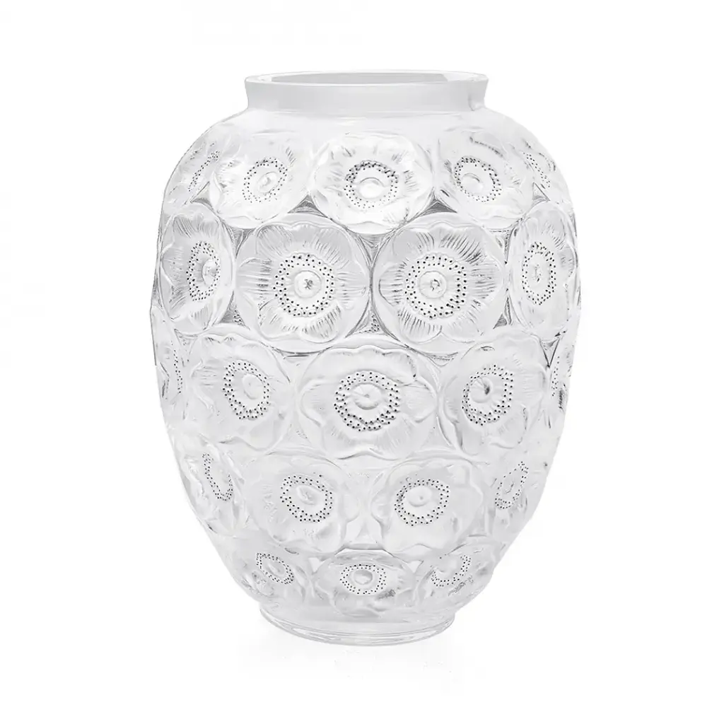 Alliance of brute strength and delicacy, juxtaposition of square shape to the curved lines of the sculpted motifs, the Pivoines vases and bowl embody a contrast of mineral strength and floral romanticism. Symbol of prosperity, beauty and honour, the peony is an emblematic flower, especially in China where it is often depicted. As if carved in the gouge of a rock garlands of flowers take possession of crystal, like luxuriant nature takes its rightful place over abandoned constructions. Their modelling also evokes the process of Lost Wax sculpture, when the craftsman breaks the plaster mould to reveal the piece. Trained as a jeweler at the Ecole des Arts Decoratifs in Paris in the late 1880's, Rene Lalique gained recognition as an independent designer for some of the era's great jewelry houses including Cartier and Boucheron. Eventually, he turned to glassmaking, and his techniques were a triumph for the Art Deco movement. Every piece of Lalique is finely detailed and produced by hand in Alsace, France.
