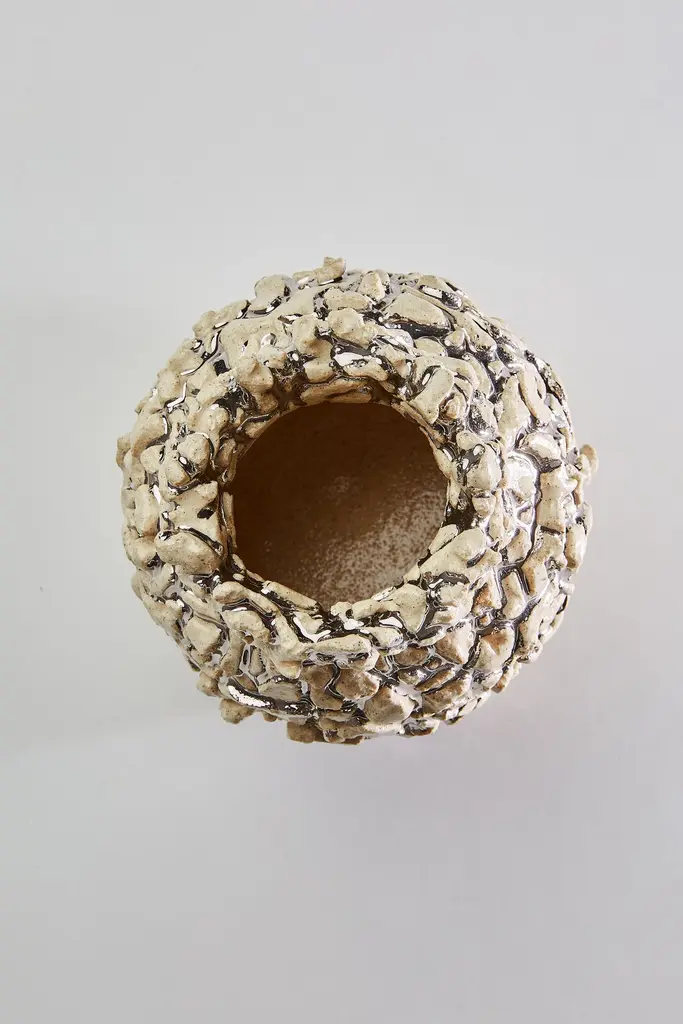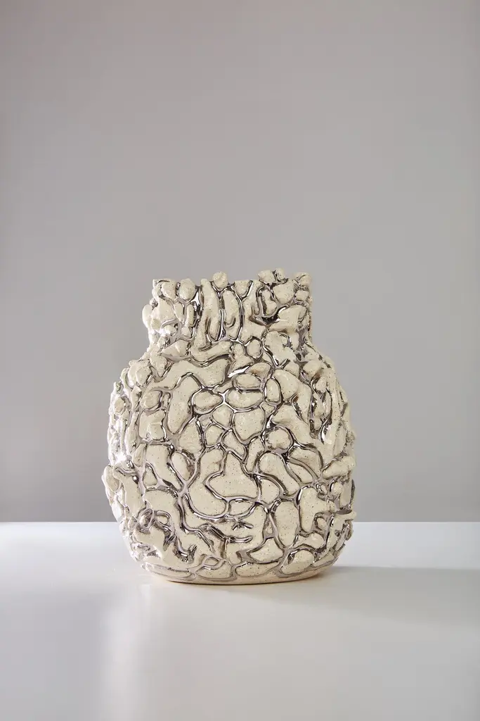 Platinum River vase by Angeliki StamatakouOne of a kind, 2022, Featured in Milan Design WeekDimensions: H13 x W12 cm.Materials: Stoneware, clear glaze, platinum.Angeliki Stamatakou is a ceramics artist based in Athens, Greece. She studied Fine Arts at AKTO University in Athens. Her work includes unique sculptural decor objects, vases, and centerpieces. For her ceramics she uses stoneware clay employing coiling, wheel throwing and sculpting techniques. She owns the entirety of the creation process, from the conceptual stage and design to the pottery making, sculpting, painting, glazing, and firing. She always strives for her creations to be original, imaginative, and more importantly, to reflect her personal aesthetic angle and emotions. Her main source of inspiration is nature, which she finds is full of treasures of various patterns, textures, and shapes. She is also influenced by modern art and various areas of design, such as architecture, jewelry, and fashion.