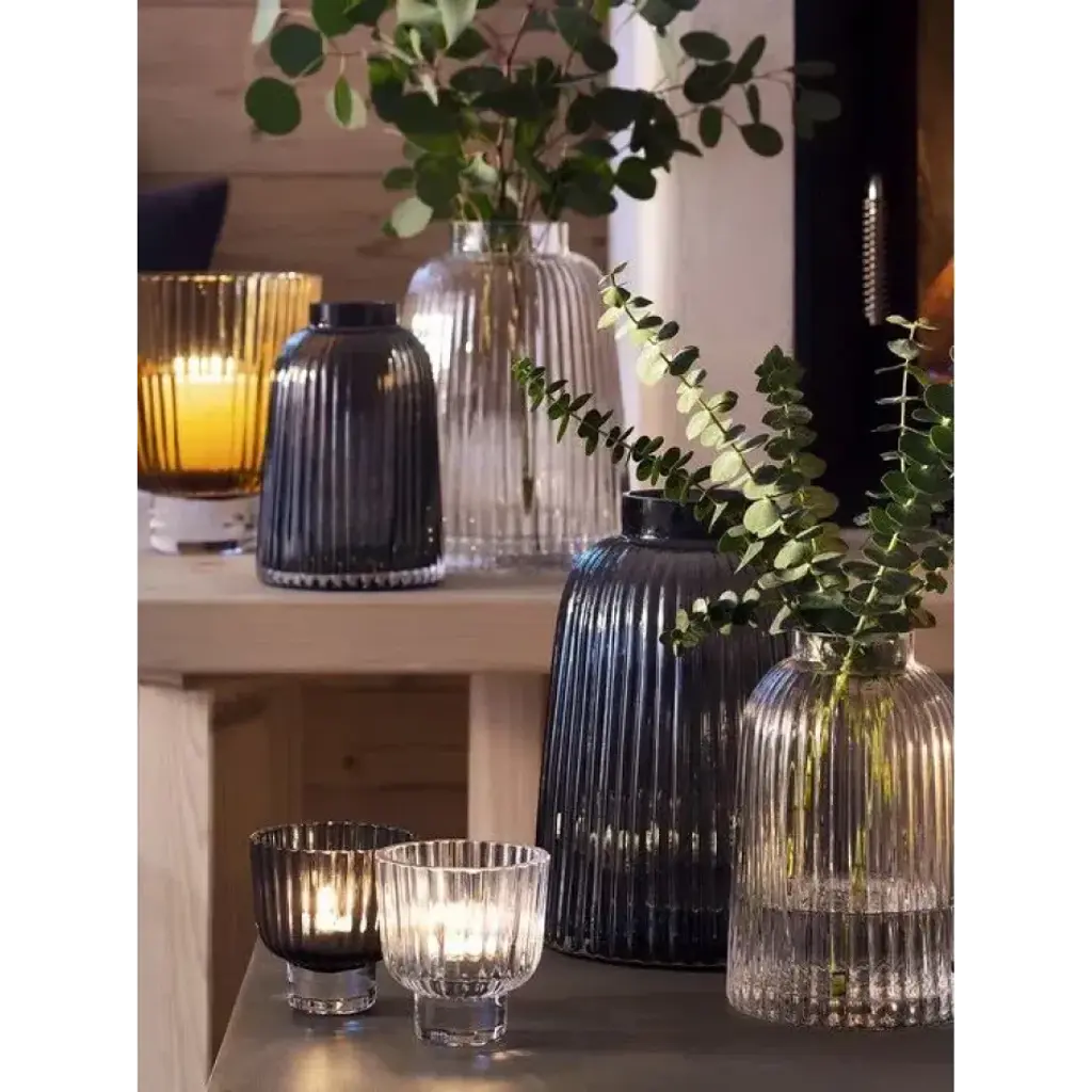 A mouth-blown glass vase with pleated texture.