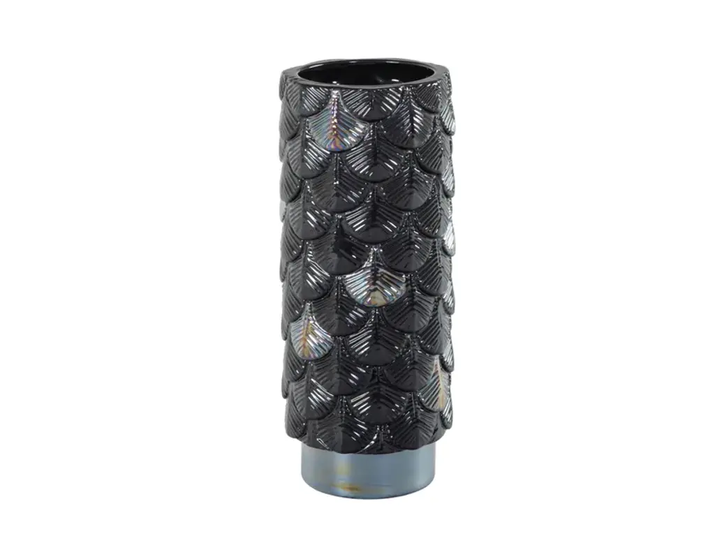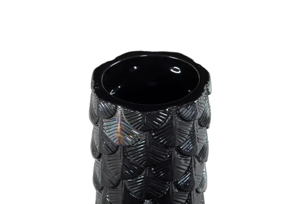 Plumage is a handmade ceramic vase.Contemporary vision and artisan excellence come together in this design element, which is added to the sideboard that uses the Plumage collection designed by Cristina Celestino for BottegaNove. This vase inspired by the plumage of birds transformed into hand-decorated ceramic tiles, designed by Cristina Celestino for BottegaNove, offers overlapping feathers, composing unexpected graphic patterns and textures. Platinum base finish exclusively for the Tonin Casa collection.