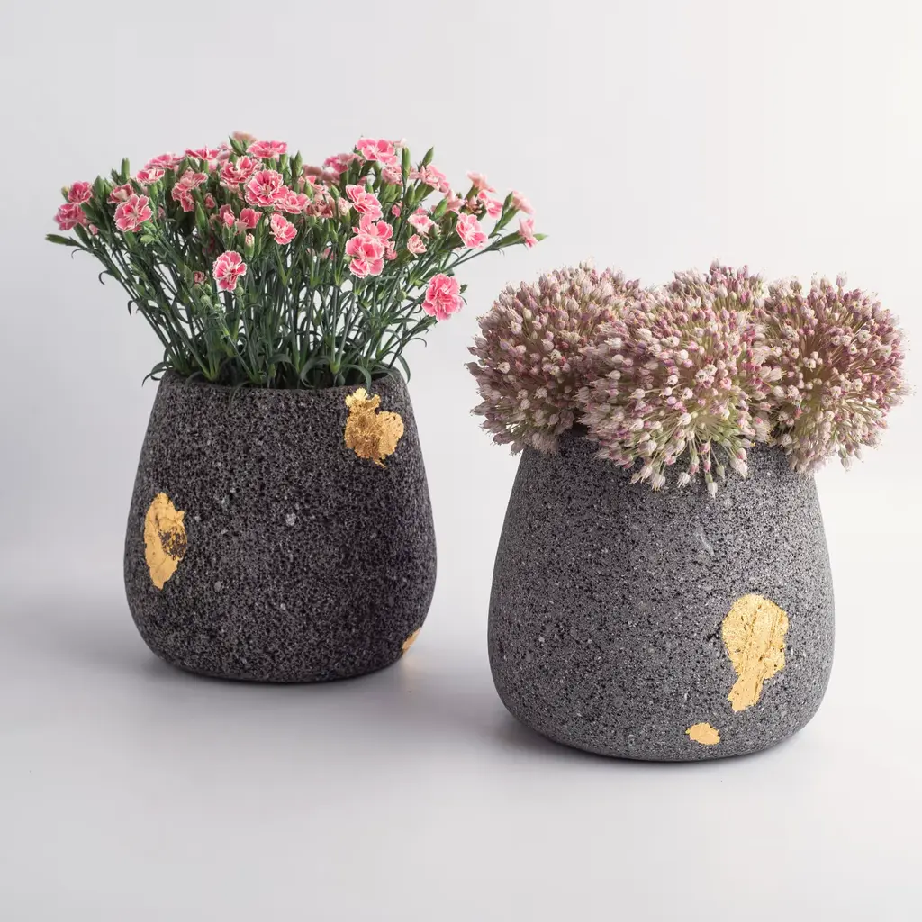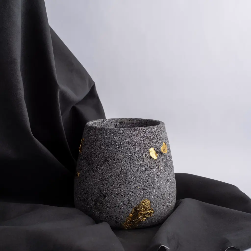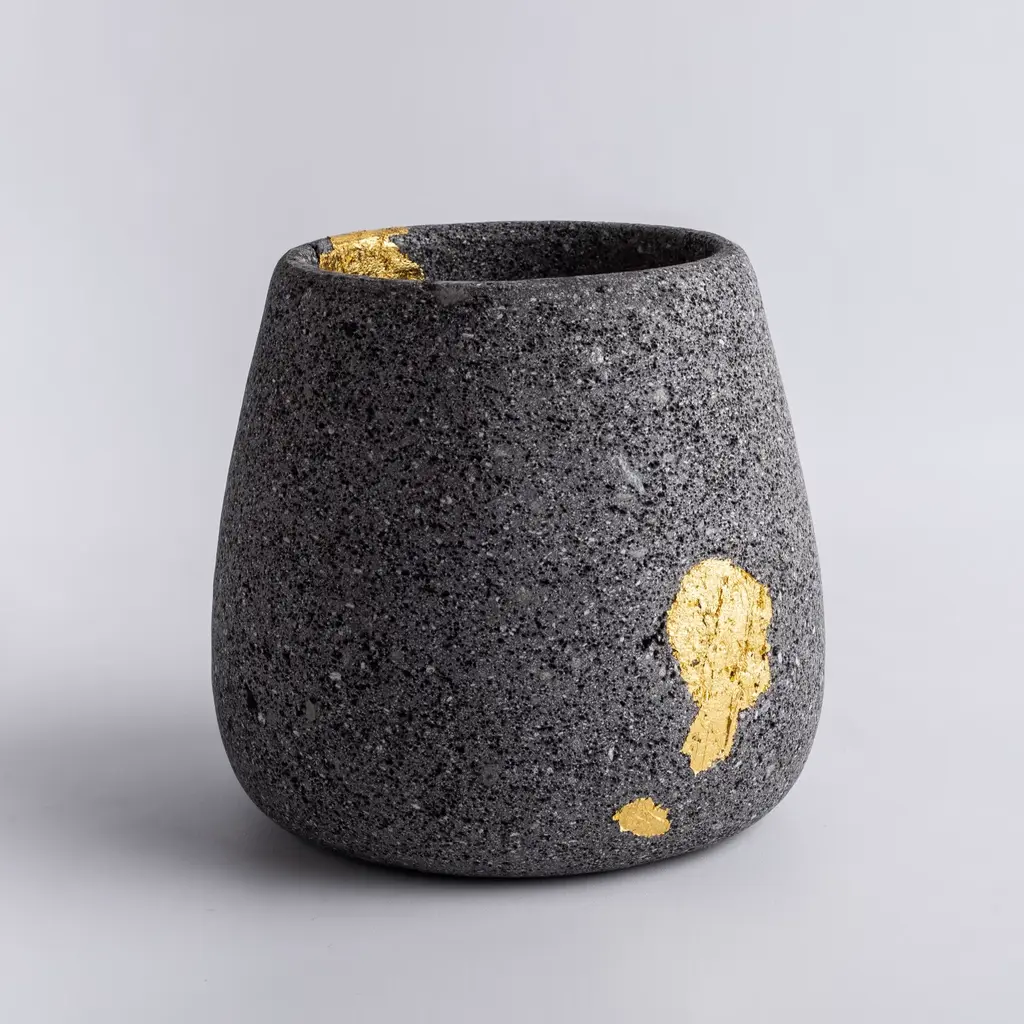 Beautiful vase carved in volcanic stone. It has distorted and scattered details of 23-carat gold leaf giving a touch of elegance and distinction.Inside it contains a custom made borosilicate glass for easy removal and handling. Beautify anywhere. Simply beautiful.