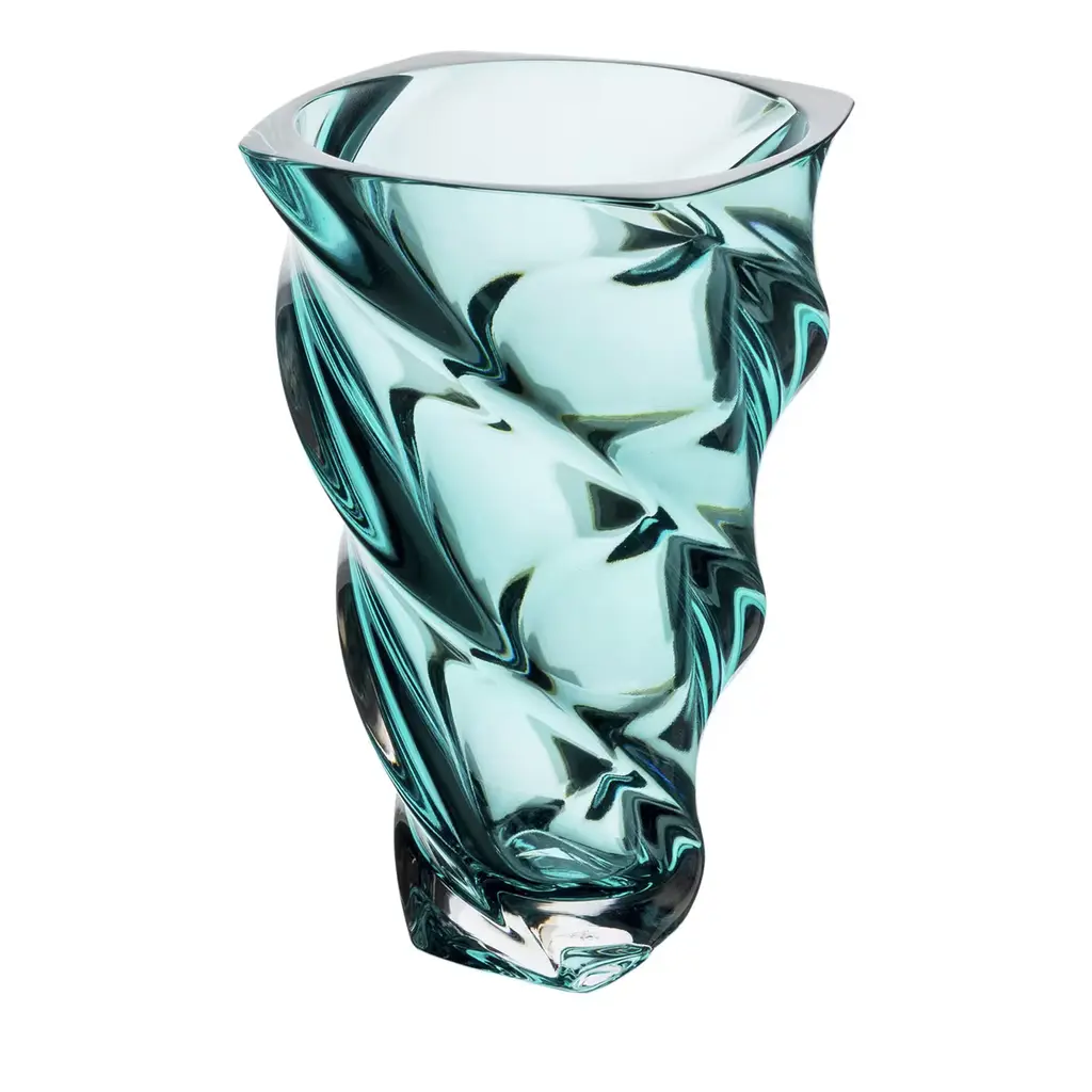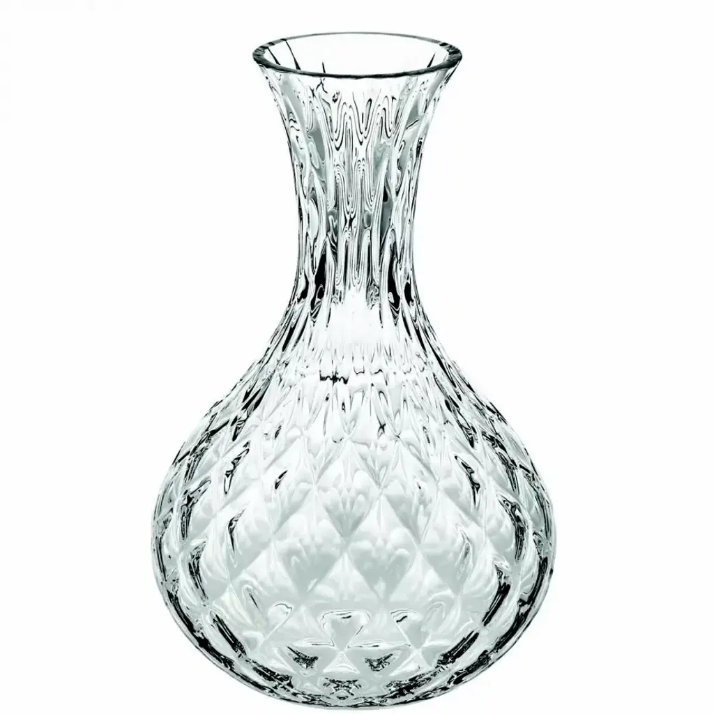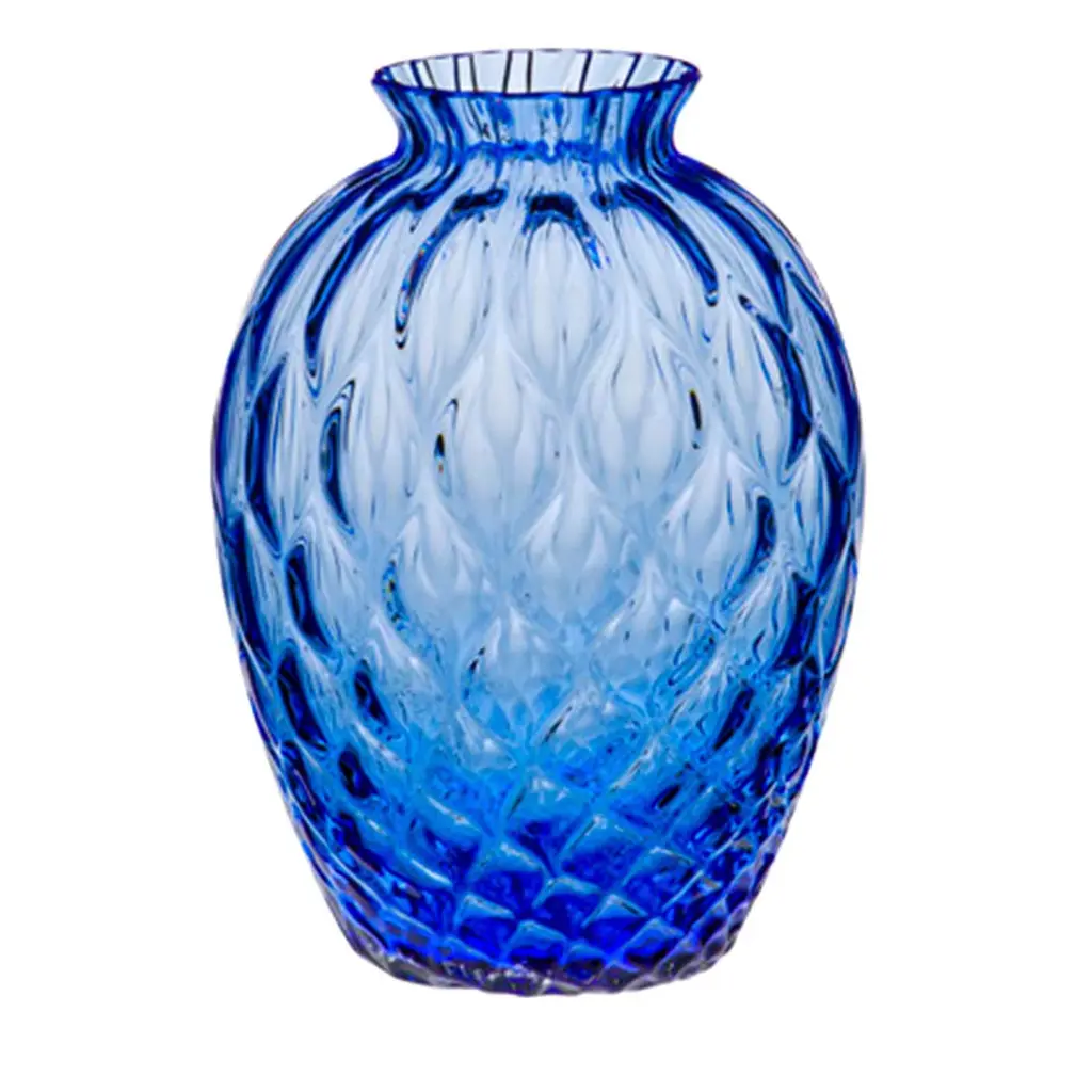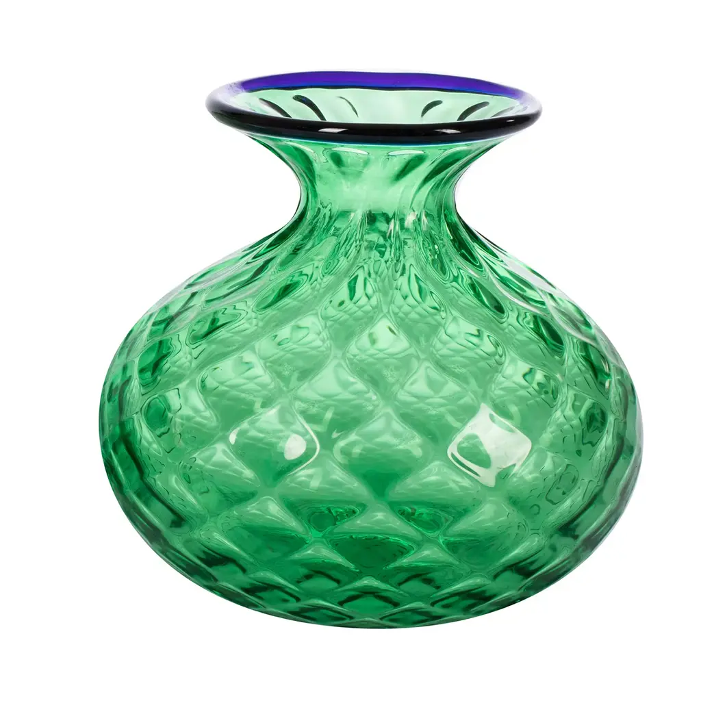 This sublime vase in fine, transparent Murano crystal is enlivened by Venetian traditional "balloton" texture, distinguished by an intriguing diamond pattern that gives the piece a stupefying optical and tactile character. A delightful solution to display flowers in classic or contemporary homes alike, it is an unrepeatable piece mouth-blown and finished by the expected hands of artist Carlo Moretti.