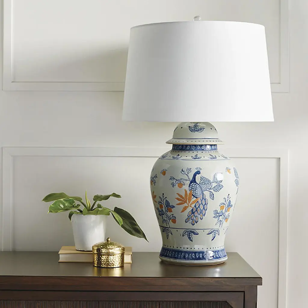 Handpainted hexagonal vase with pomegranates at neck. Shade is off-white satin octagonal clover bell, piped and lined; front and back of shade are serpentine. Accommodates three way bulb up to 150 watts. On-off switch on socket.Measures 16½" w x 12¼" d at base of shade x 28½" h to top of matching handpainted porcelain finial.Item #: 1013E-EELPBGL