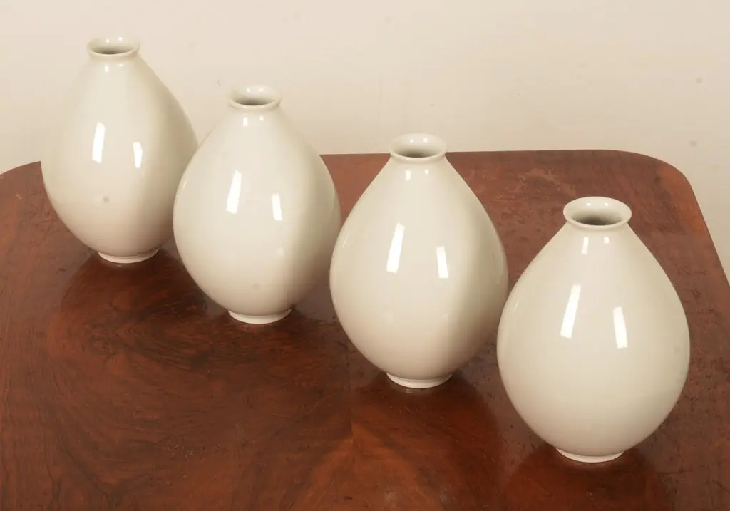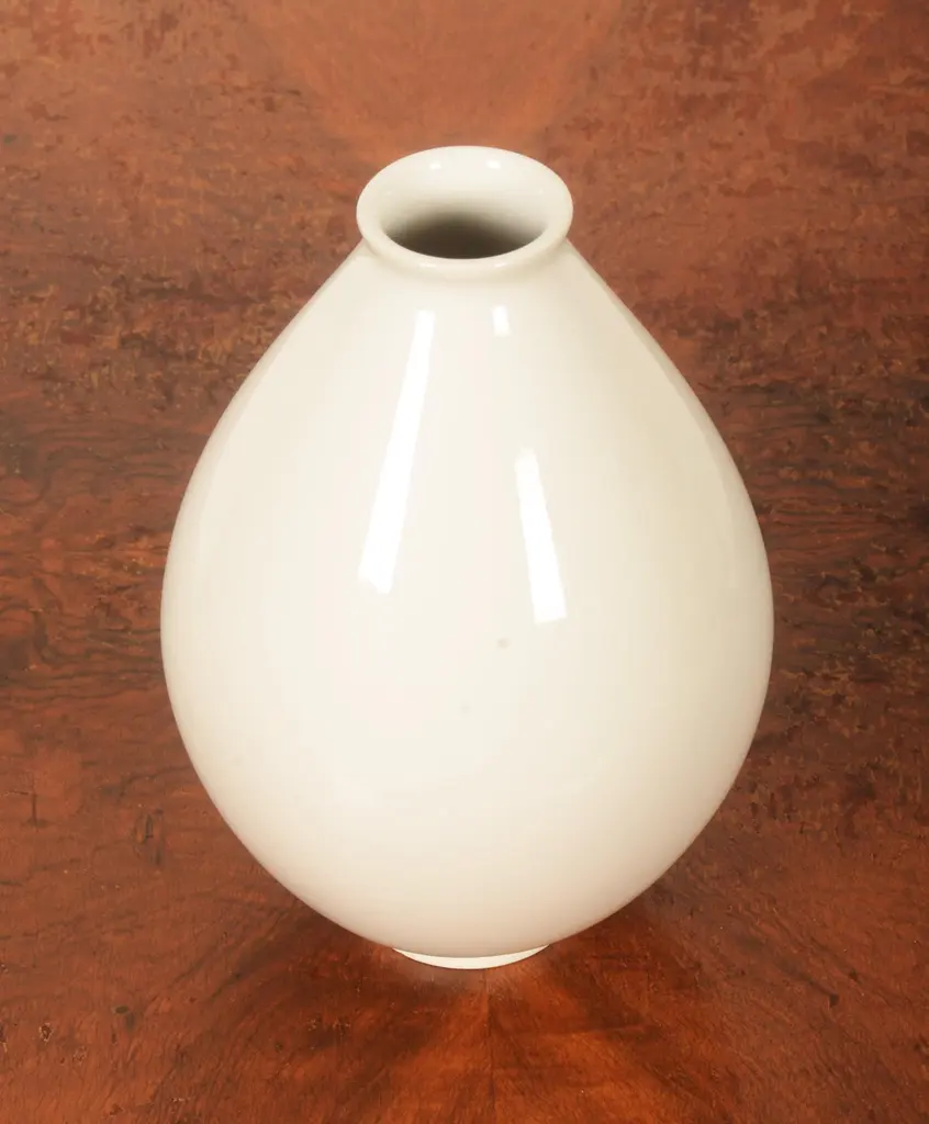 Drop-shaped white porcelain with glossy glaze, designed by Liselotte Lüpke in 1939, this one was produced in the 1950s. Up to 4 piceses available, price per vase.