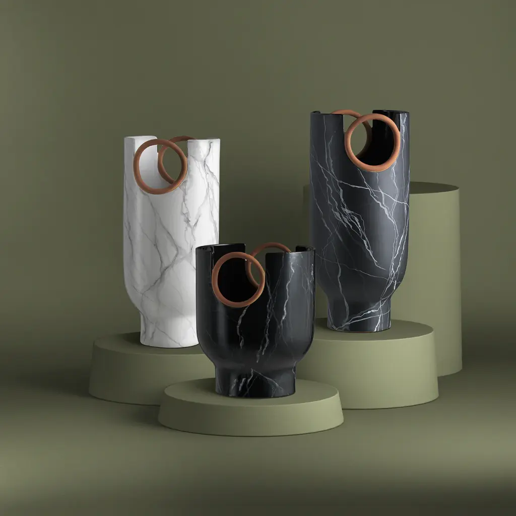 The soul of marble is transcribed on the ceramic of this vase, rich in visual and material contrasts. This is a clay vase, with waxed terracotta rings hand thrown on the sides. Made in a matte black glaze and matte white decorations imitating the texture of marble. Designed by Luca Binaglia.