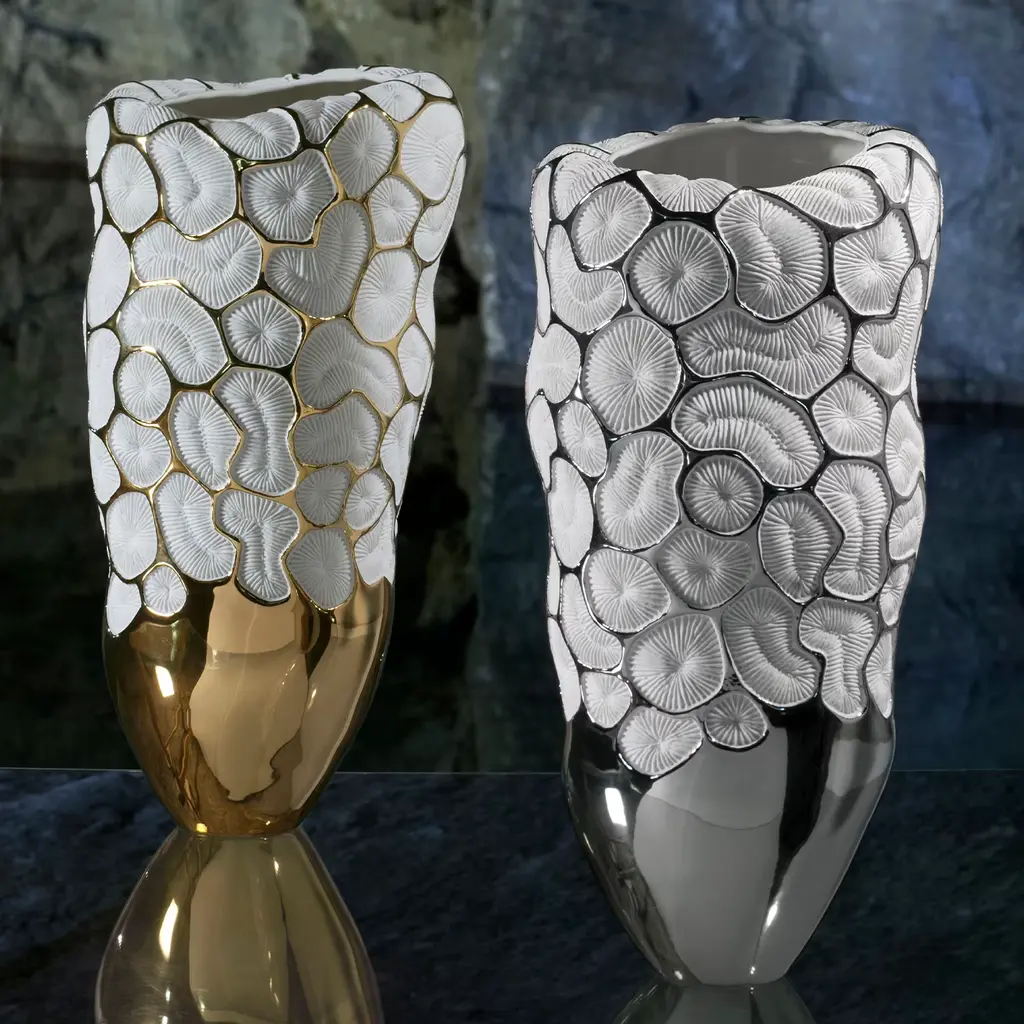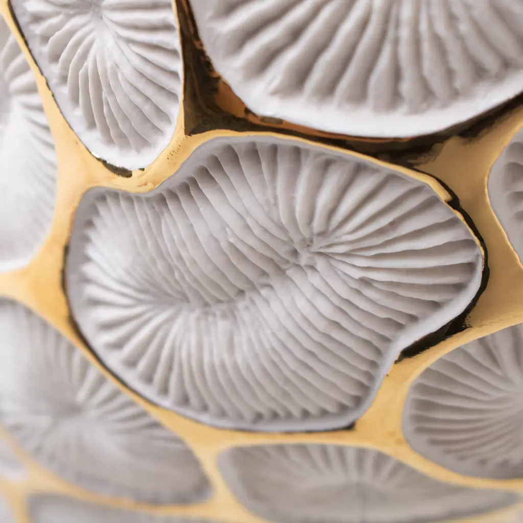 Introduced at Milan Design Week 2019, this superb vase boasts contrasting colors and textures and noble materials for a luxurious effect. It is crafted of unglazed porcelain evident in the minute accents enlivening its body, evocative of madrepore fossils. Meticulously crafted, this piece boasts a bottom part and inserts in 24k gold that was hand applied before firing the vase to fix the precious metal.