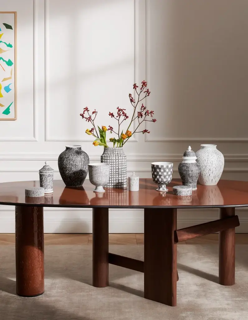 The Formafantasma designs become decorations on the porcelain, thanks to the know-how, skills and experience of the Ginori 1735 master painters who, working with natural ease, leave their mark through instinctive gestures, abstract signs that contemporize the concept of the design. The collection includes a series of different-shaped vases, contemporary pieces that can stand alone or be combined to create graphic compositions. The uniqueness of the handiwork consists of the “graffito” decorations on bisque porcelain obtained through direct firing: the graffito is designed on the surface with a black pigment and then set.The designs are entirely hand-drawn with special ceramic chalk crayons. Each object is one-of-a-kind, both in terms of the texture of the porcelain, as well as the emotional dexterity with which it is made. Each piece, numbered by the artist who decorated it, bears the Cassina and Ginori 1735 logos.“GRAFFITO” DECORATIONon bisque porcelain BISQUE PORCELAINpainted with black ceramic chalk LOGOCassina and Ginori 1735 logos