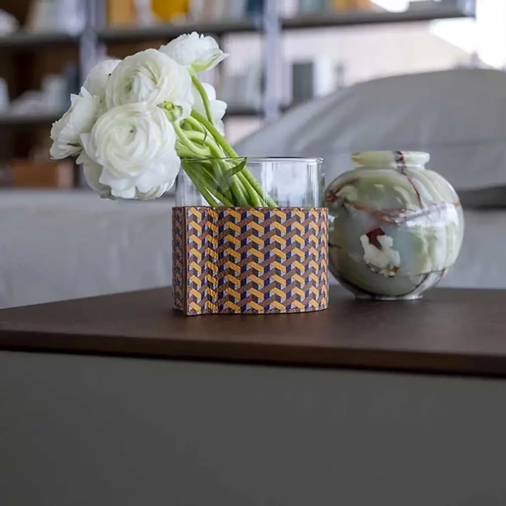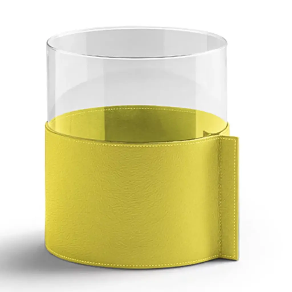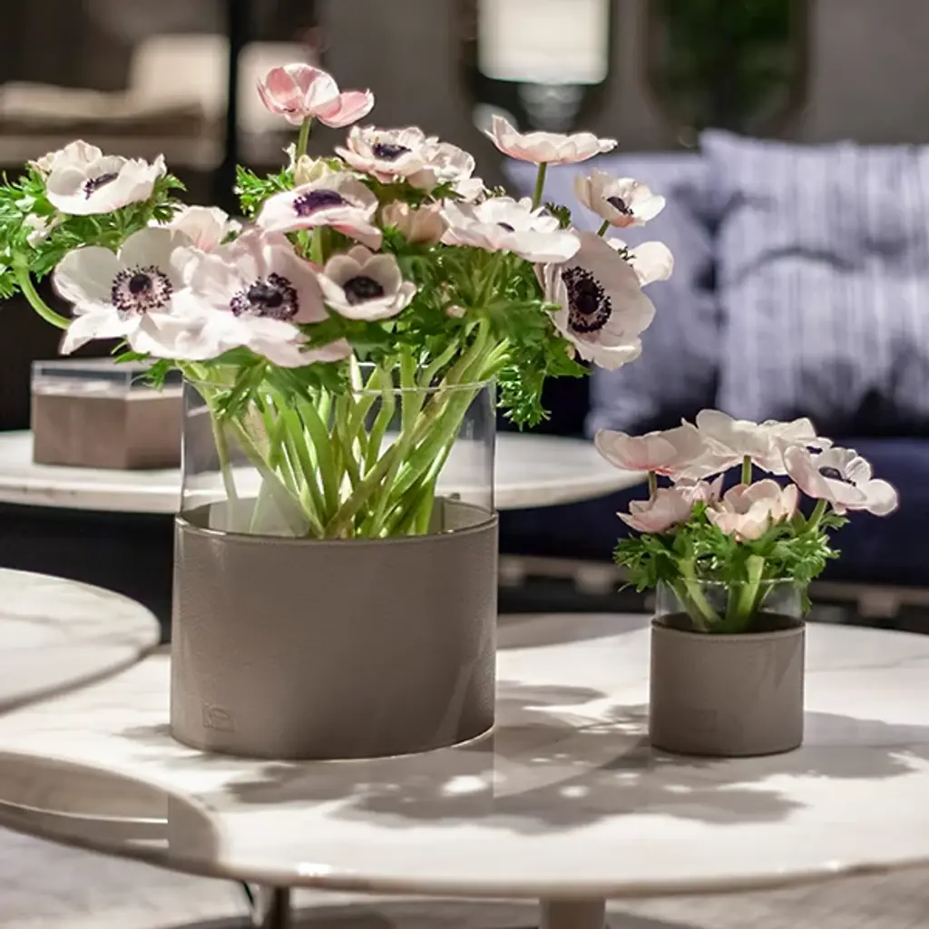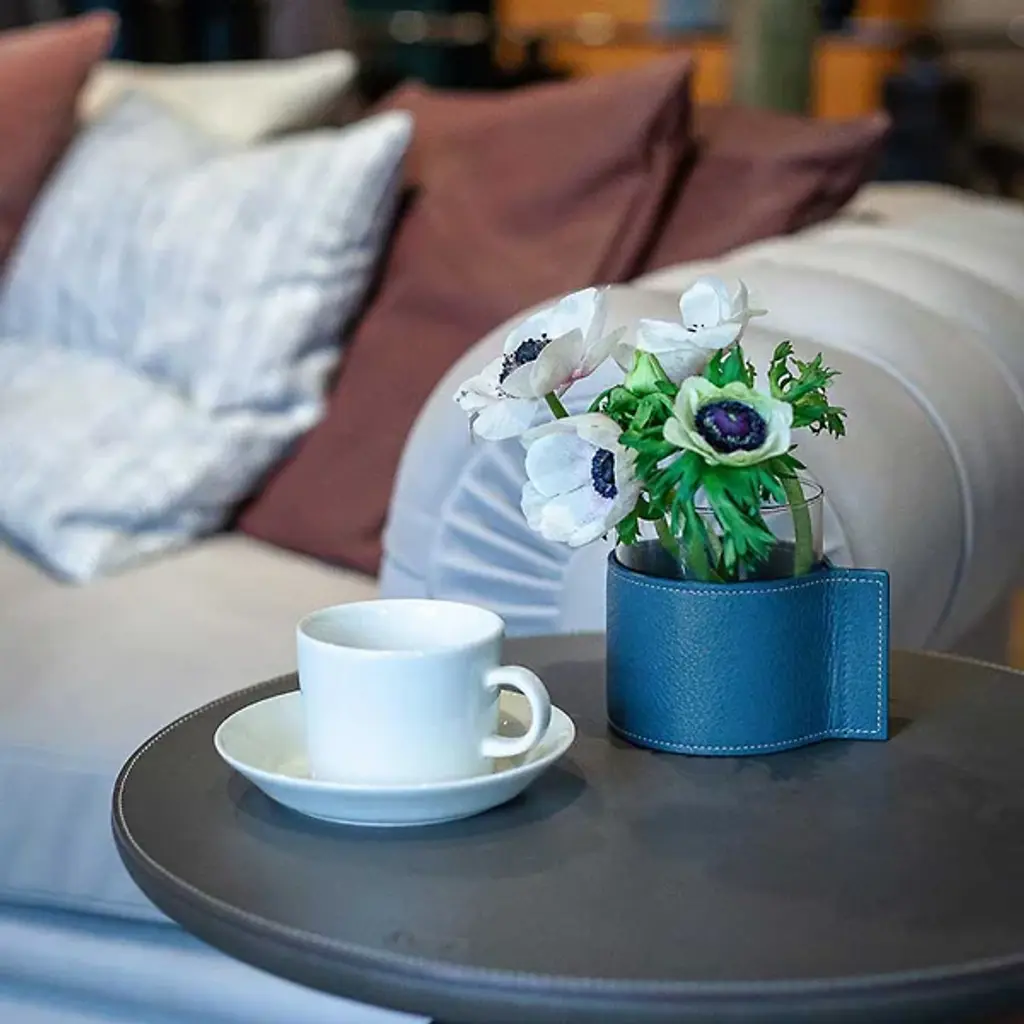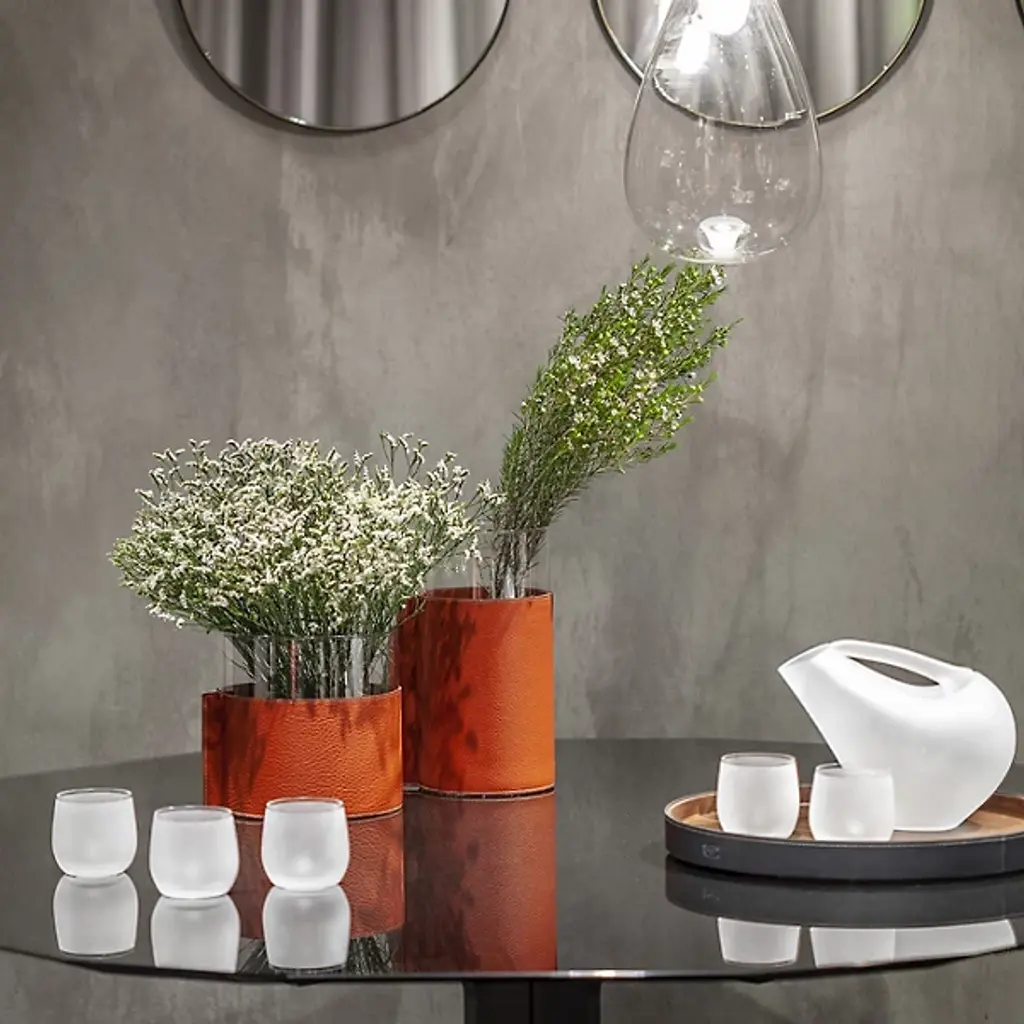 The Pot Leather Vase by Poltrona Frau features a transparent glass cylinder encased in luxurious Pelle Frau® leather covers. Adorned with contrast stitching, this vase possesses a unique grip and is the collection’s signature design element. The rims are hand-finished in tone-on-tone colors, adding a refined touch to these elegant vases.