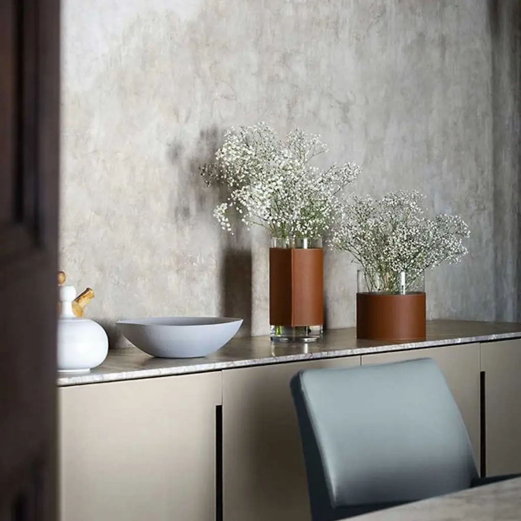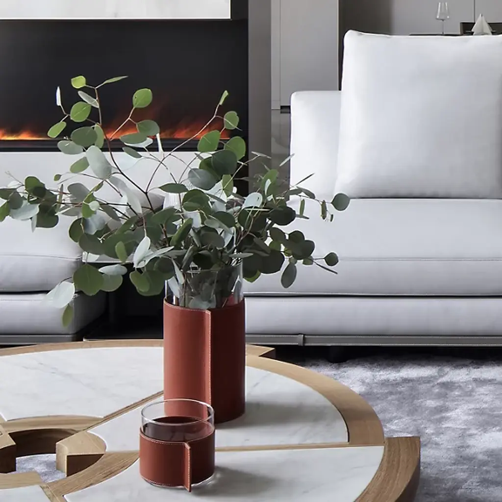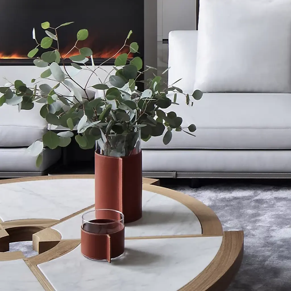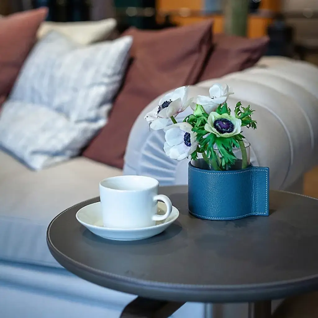 The Pot Leather Vase by Poltrona Frau features a transparent glass cylinder encased in luxurious Pelle Frau® leather covers. Adorned with contrast stitching, this vase possesses a unique grip and is the collection’s signature design element. The rims are hand-finished in tone-on-tone colors, adding a refined touch to these elegant vases.