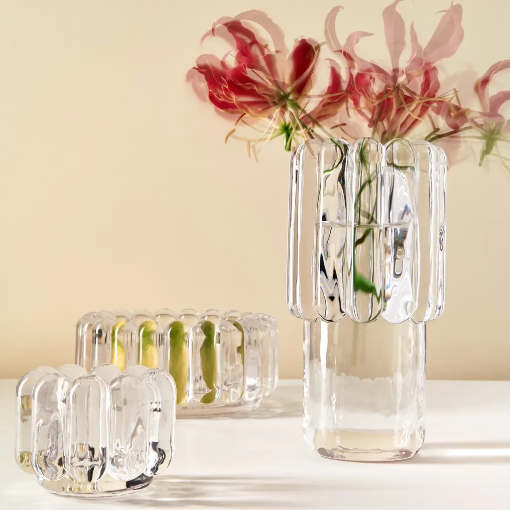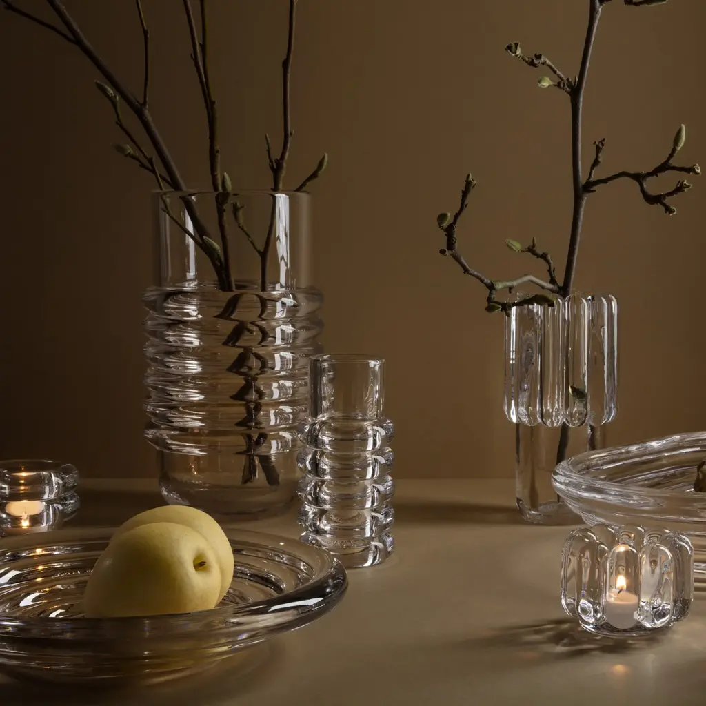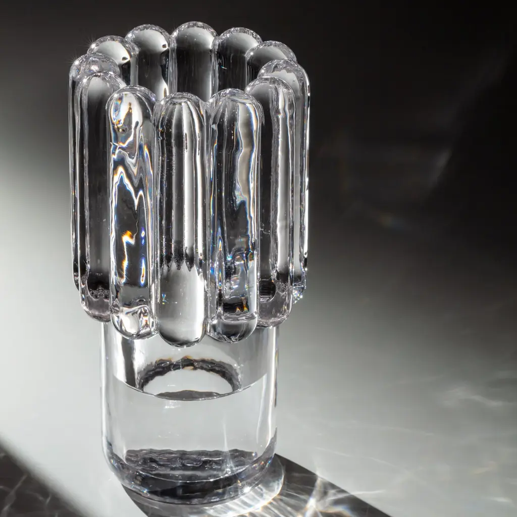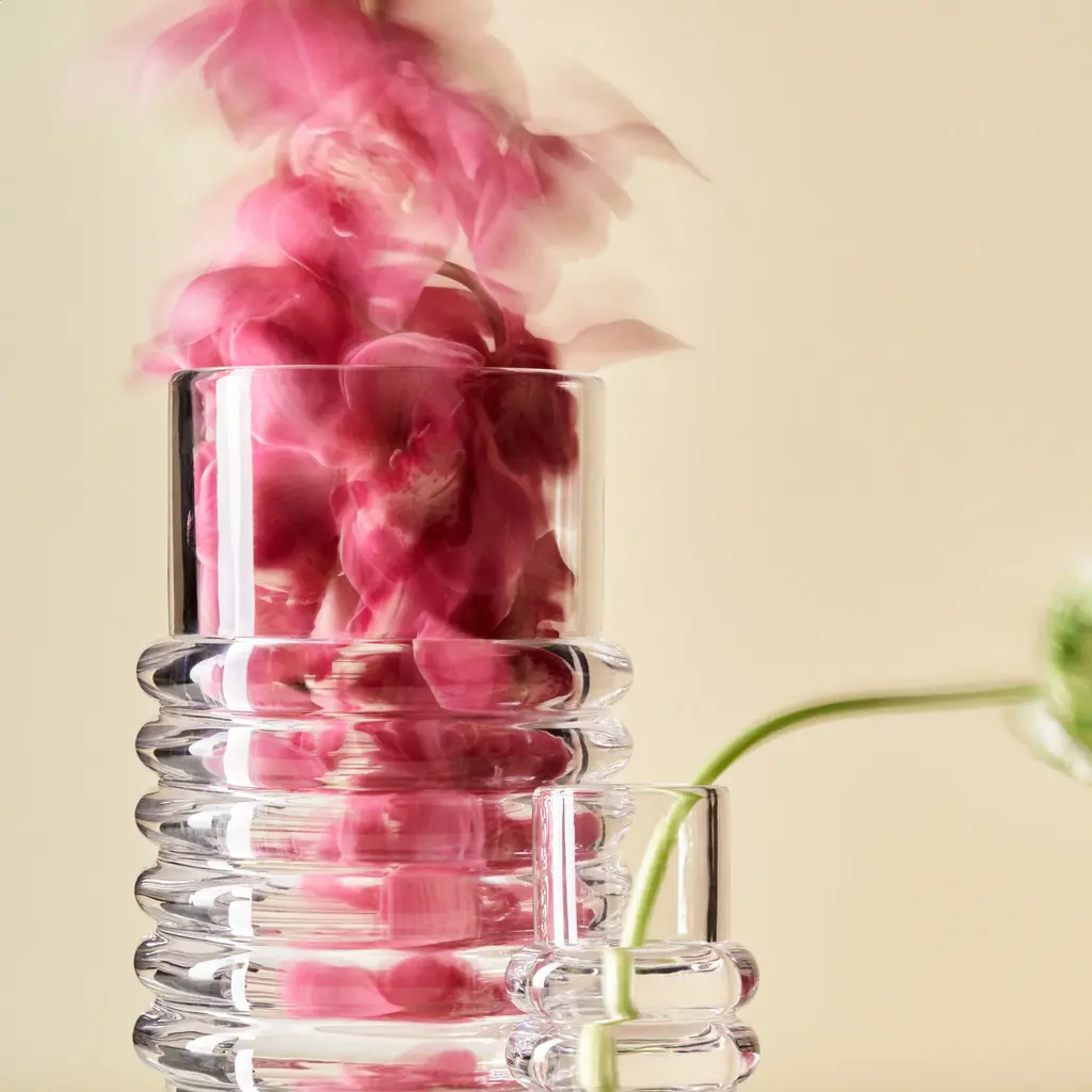 Press brings a new dimension to glassware with a vase that is beautifully engineered to catch and refract the light. Designer Tom Dixon explores the optical properties of clear glass in a heavyweight grooved shape that is manufactured by dropping globs of molten material (at 1,200 degrees centigrade) and pressing it into 2- and 3-part molds. Available in a choice of sizes, Press is an impressive statement-piece and comes in gift-worthy packaging.