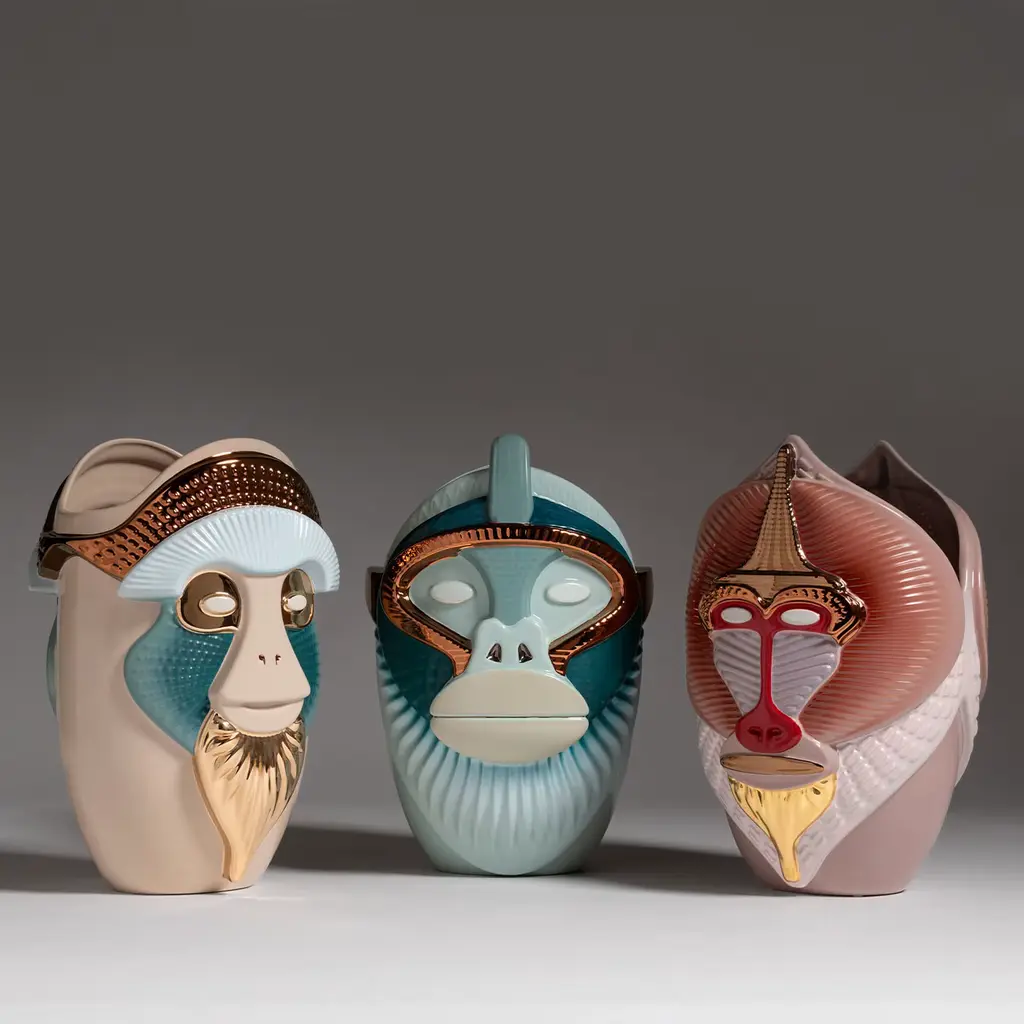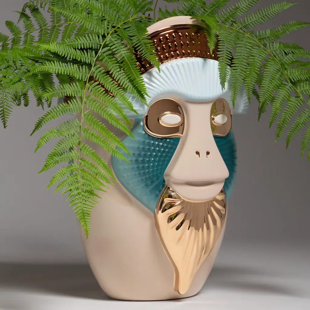 The Primates Brazza beige Vase is a striking addition to any home décor that embodies the enchanting interplay between humanity and nature. This vase is part of a visionary collection crafted from fine ceramic, beautifully capturing the likeness of the ape, an animal evocative of human form and expression. The vase's unique design showcases a playful mix of glossy greyhound, biscay bay hues, and carefully selected metallic details, giving it a vibrant character and charm. Its multi-dimensional textures not only elevate the aesthetic appeal but also invite touch and admiration, making it a conversation starter in any setting. This medium-sized decorative piece is perfect for displaying flowers or standing alone as an artistic statement. The Primates collection offers a powerful reminder of our connection to the natural world, bringing a sense of vitality and elegance into living spaces.