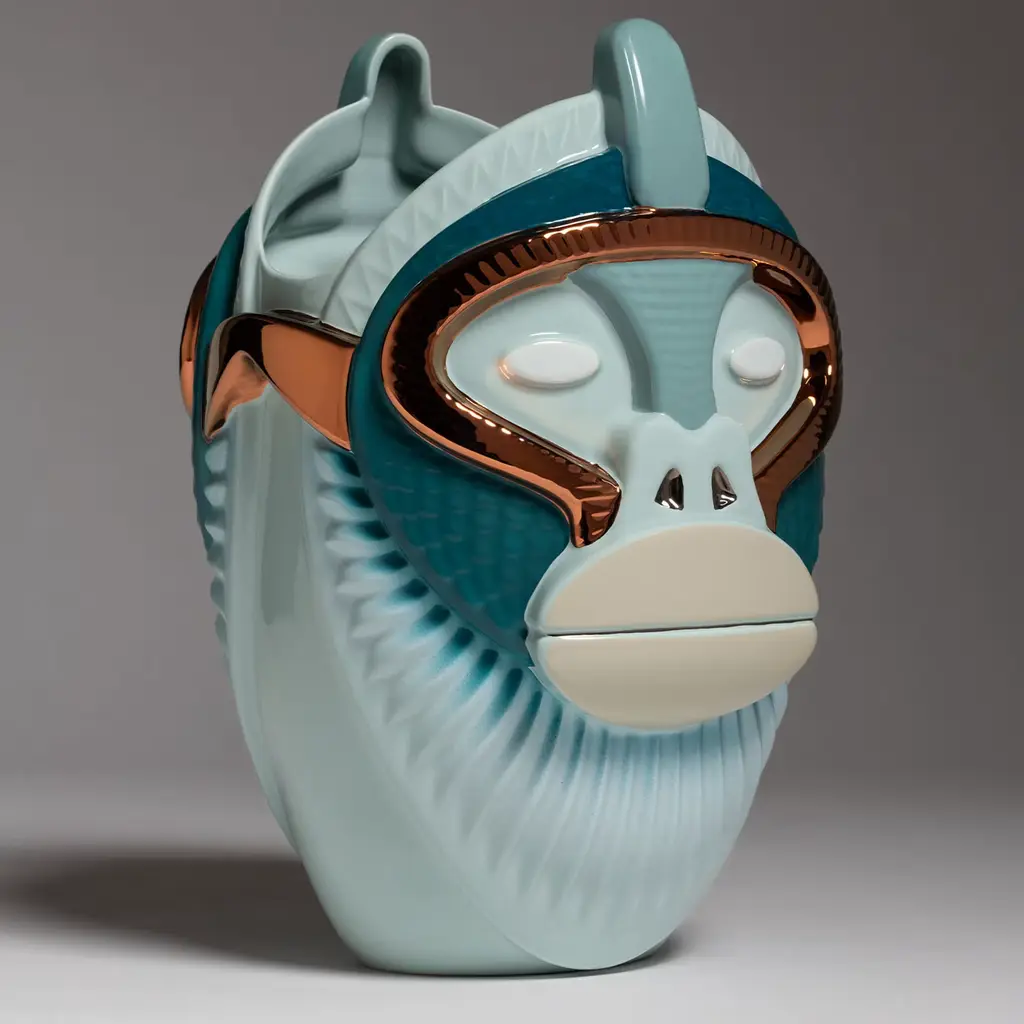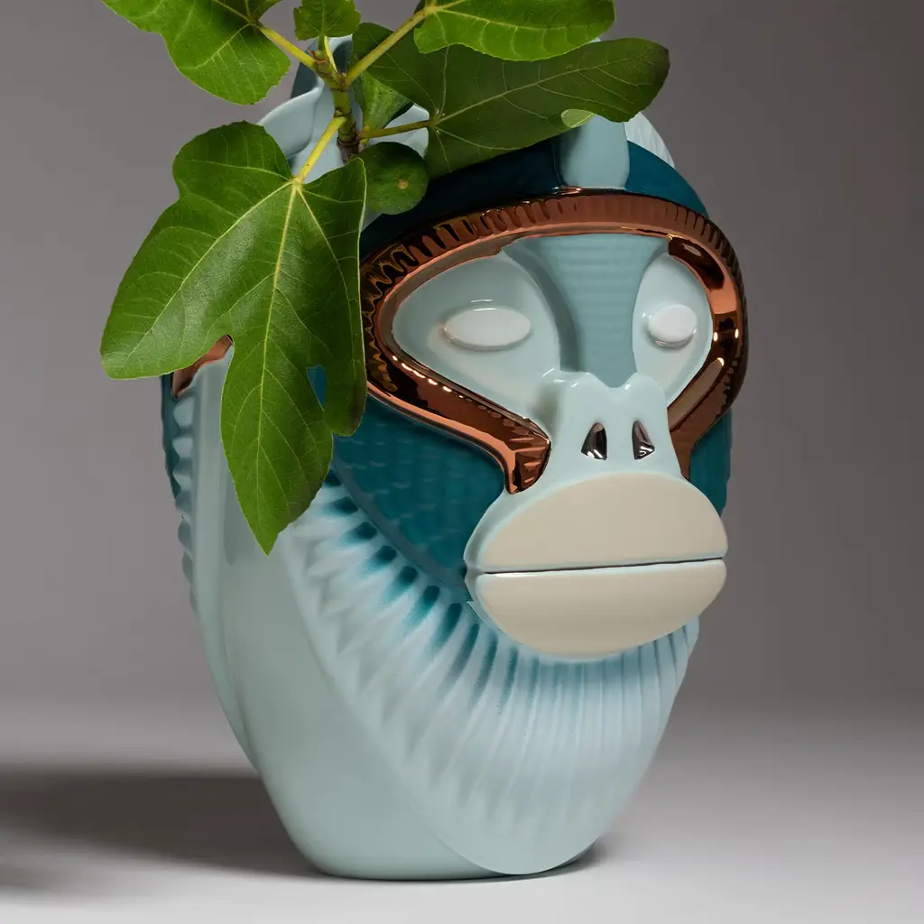 The Primates Kandti Vase is a captivating fusion of artistic expression and nature-inspired design. Part of a unique collection that explores the profound connection between humans and primates, this decorative vase transforms the expressive features and movements of an ape into a striking home décor piece. Meticulously crafted from fine ceramic, it is adorned with glossy vintage green and biscay bay hues, enriched by elegant precious metal details that enhance its vibrant textures. Every curvature and line is thoughtfully designed to invite admiration and spark conversation, making it a statement of both craftsmanship and artistic vision. Ideal for floral arrangements or as a standalone sculptural piece.