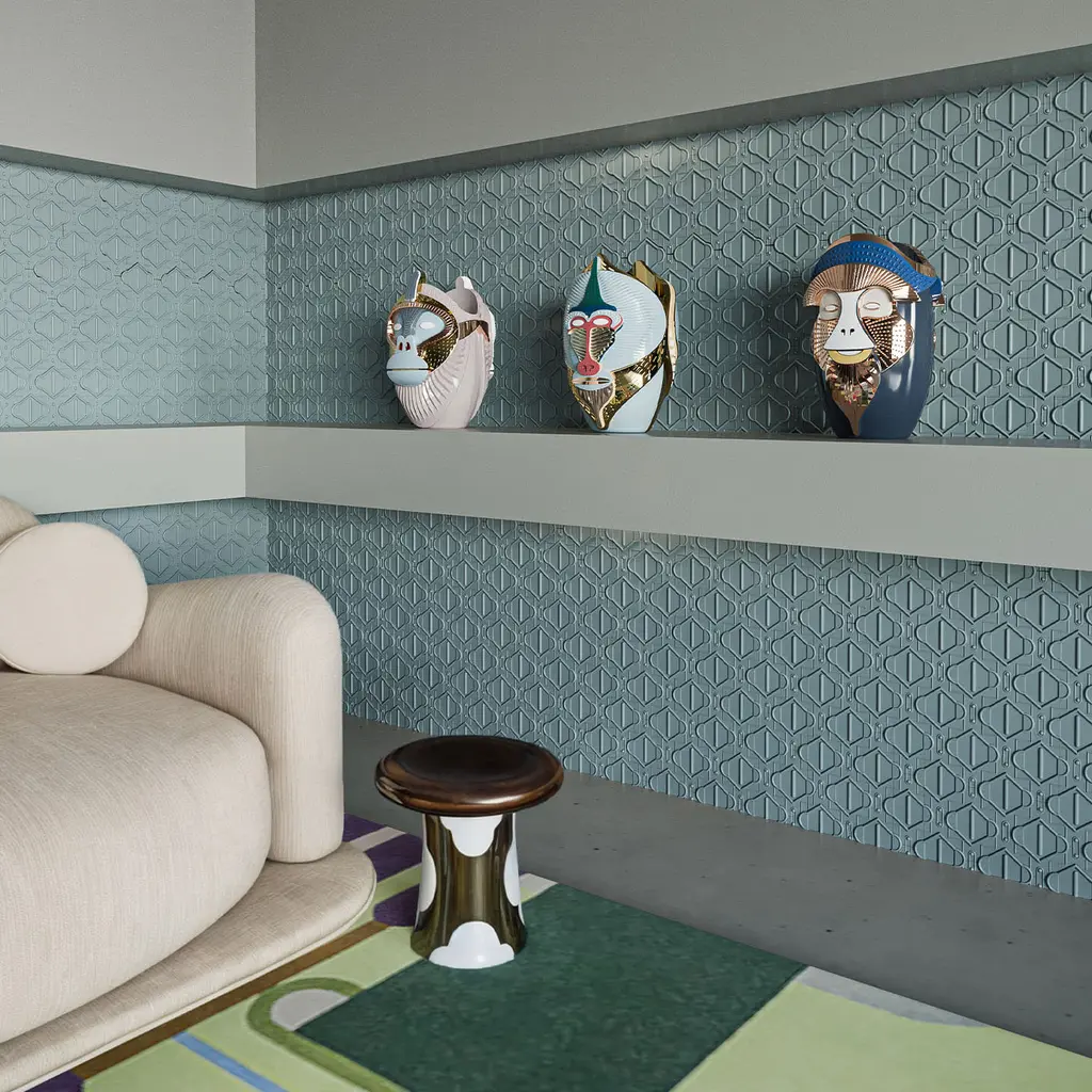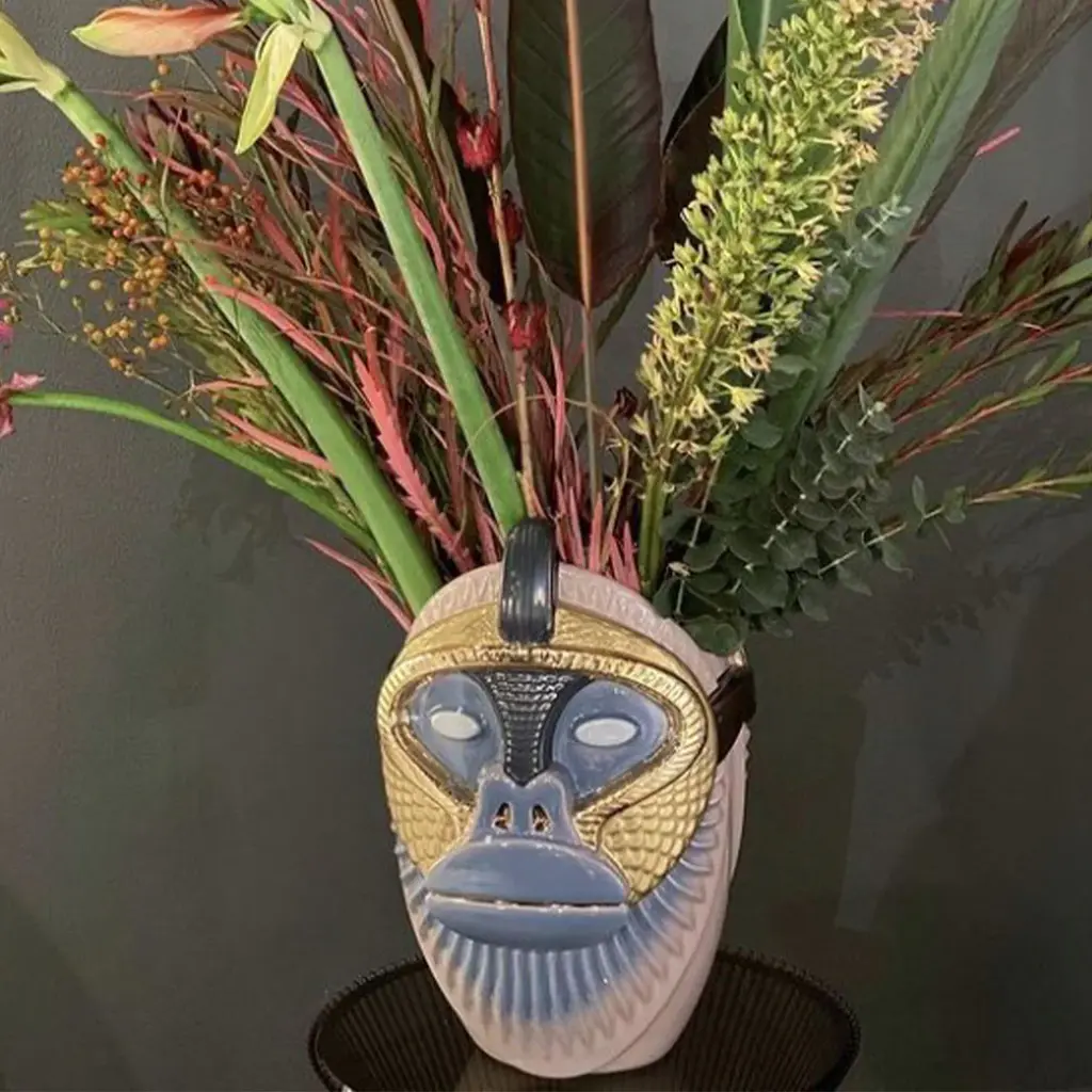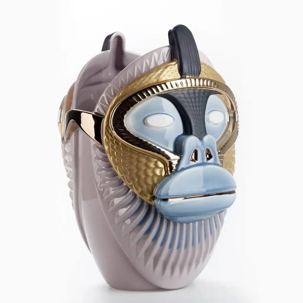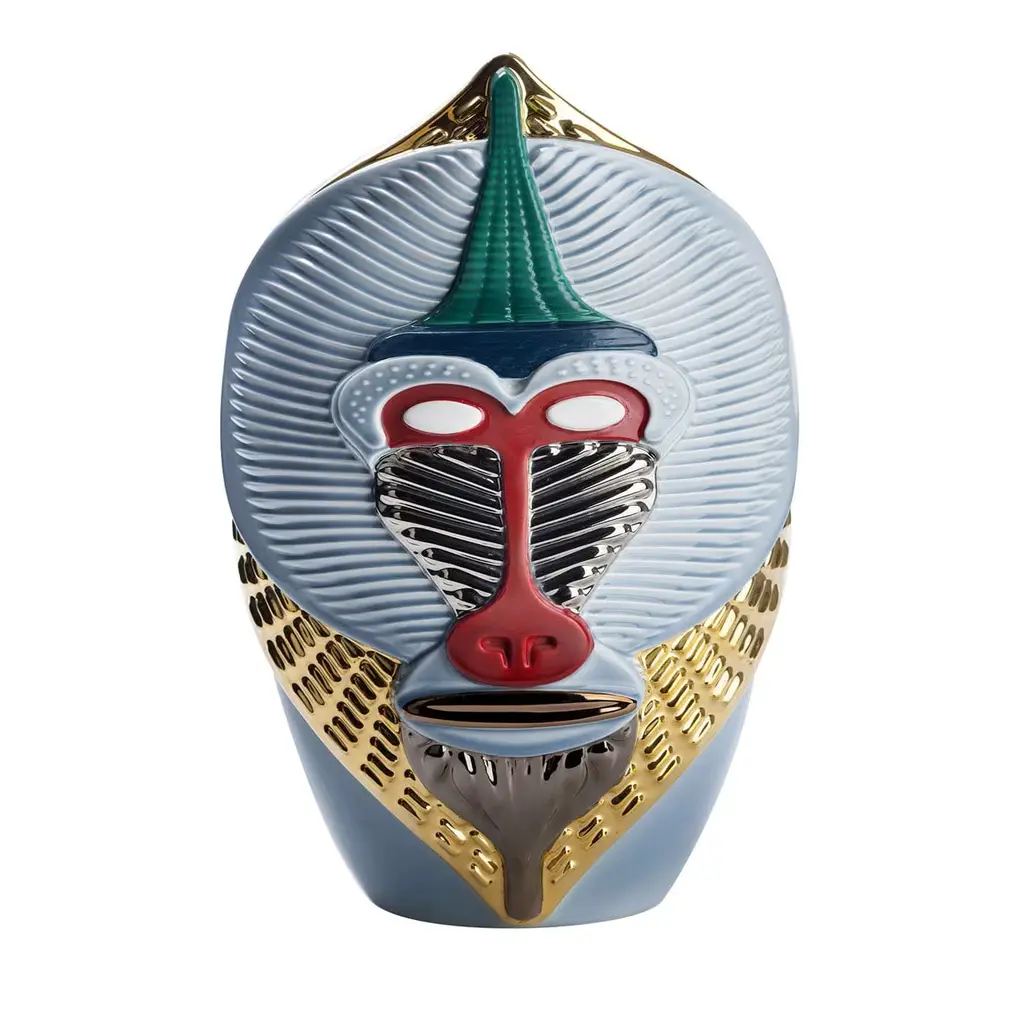 The Primates Kandti Vase is a stunning creation inspired by the profound connection between humans and primates. This exquisite piece embodies powerful symbolism, celebrating the shared essence found in their forms and movements.Crafted from fine ceramic, the vase captivates with its glossy lilac grey and sugar paper hues, enriched by precious metal details that elevate its refined aesthetic. The bold interpretation of features, combined with meticulous detailing, creates a dynamic visual appeal that stands out in any setting.