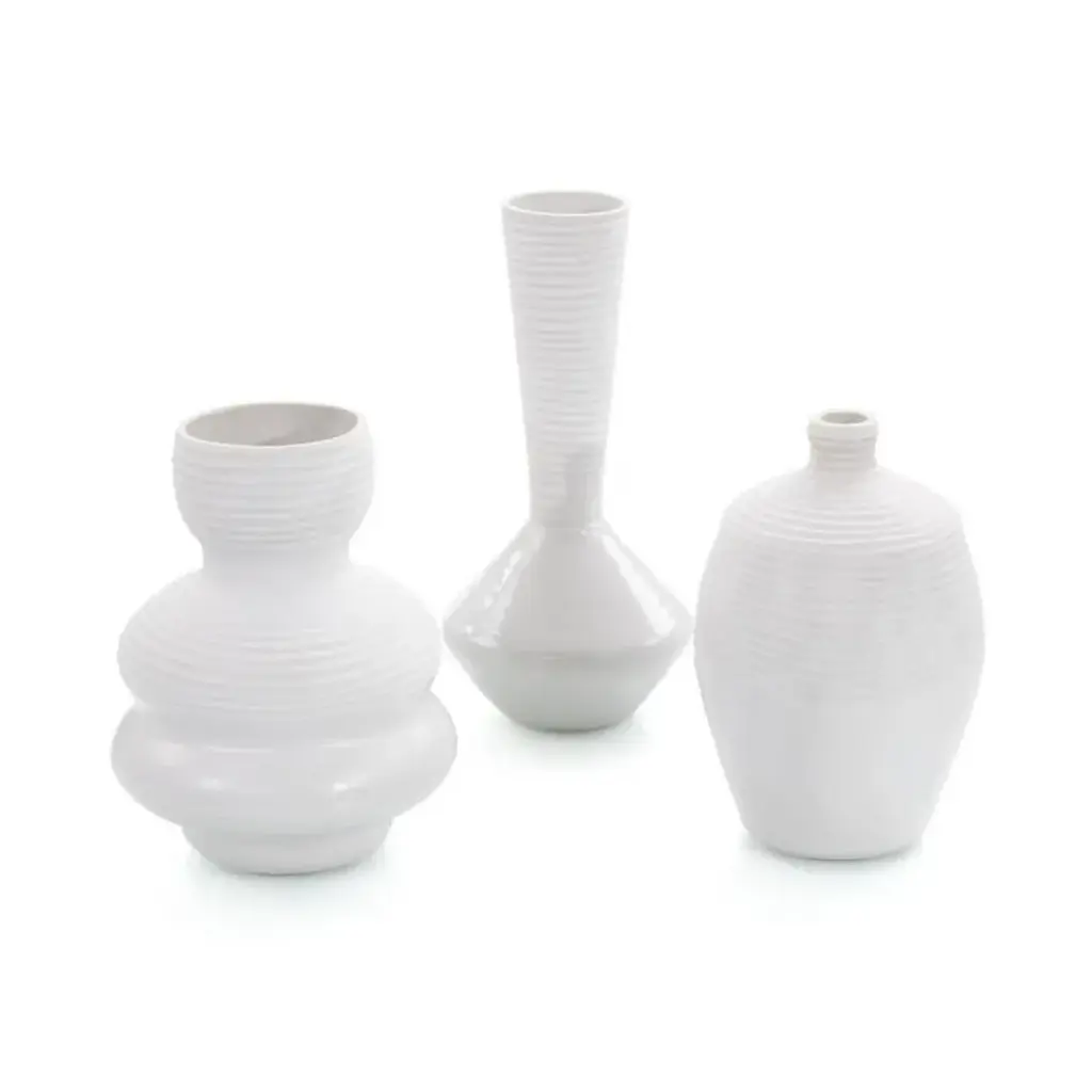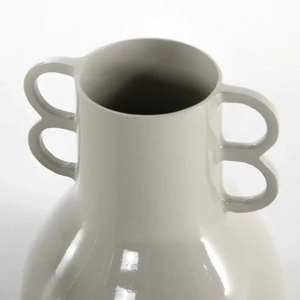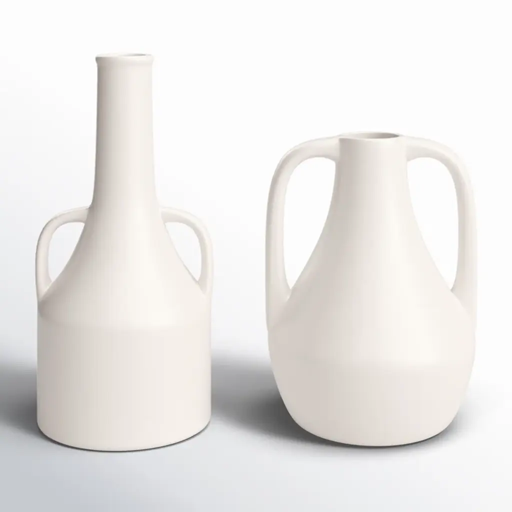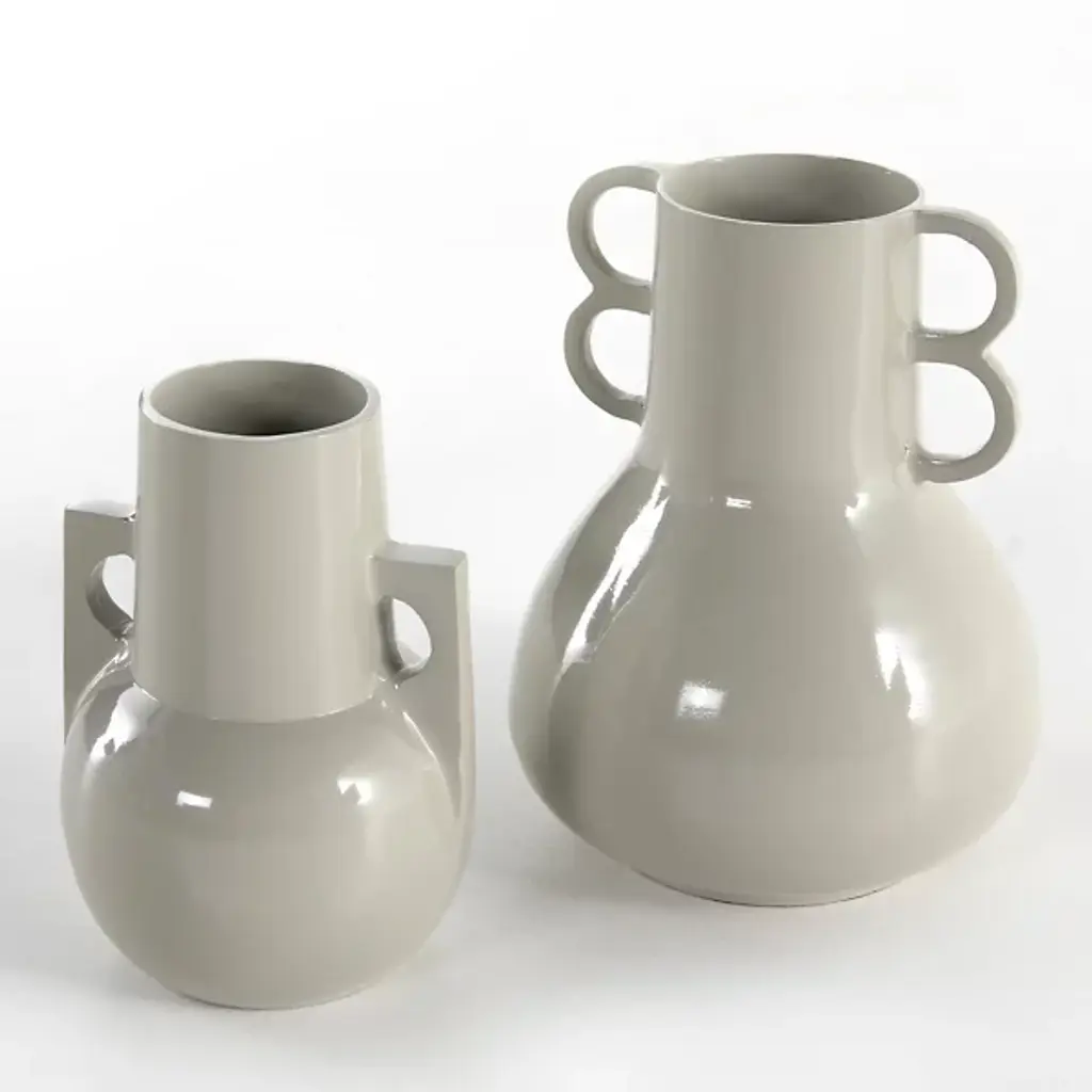The Primrose Vase, Set of 2 from Four Hands challenge traditional vessel design with their unique geometric handle configurations. Each aluminum vase presents a playful take on classic forms—one with squared handles and another with circular loops. The bulbous bases taper to sleek necks, creating an intriguing profile that works with or without floral arrangements. The understated craftsmanship allows these vessels to integrate into numerous design settings. Their sculptural quality makes them conversation pieces, whether displayed together or separately.