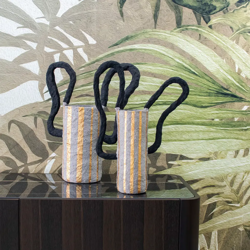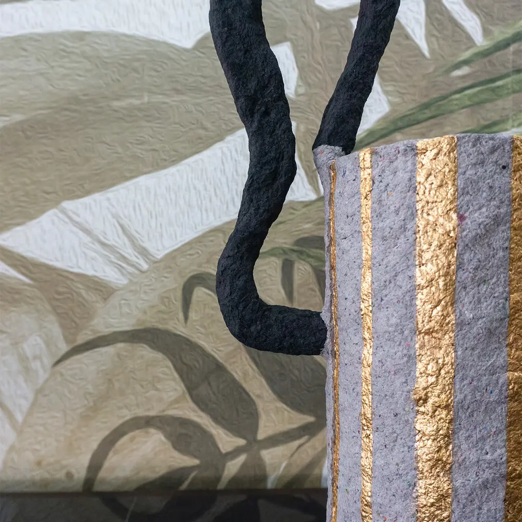 A decorative vase characterized by vertical gold and grey stripes, crafted through a slow, artisanal process using natural, sustainable materials such as paper and clay. This piece reflects a blend of ancient paper-mâché techniques and contemporary design, emphasizing regenerative material use and emotional connection through its textured surface and bold color contrast. Ideal as a statement element in home décor, it embodies values of craftsmanship and environmental responsibility.