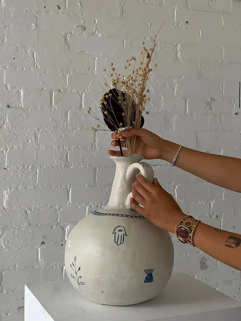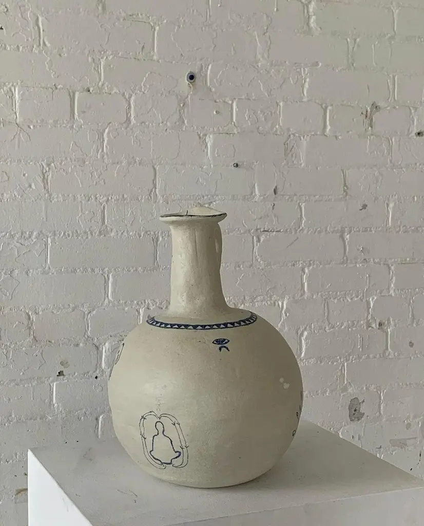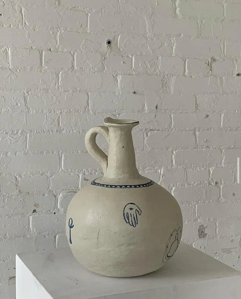 Protector vase 1 by Solem CeramicsDimensions: Ø 25.5 x H 35.5 cm.Materials: White stoneware, blue underglaze, glazeThis vase is water safe. Solem’s work pulls from memories of the architecture and community within SWANA and Southeast Asia thorough exploring familiar shapes, colours and textures from these regions in which she found comfort. We have the ability to revisit timelines– to reutrn to a place that may feel lost, or one that has never existed– through finding peace in yearning. To find the peace in yearning is to bridge the metaphysical gap between the physical self and the essence of Home, and therefore, exist in multiple places at once.Clay is a multidimensional mirror. It is affectionate, communicative, intuitive and confrontational.