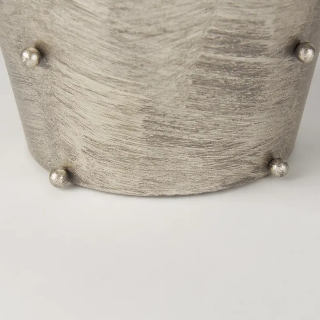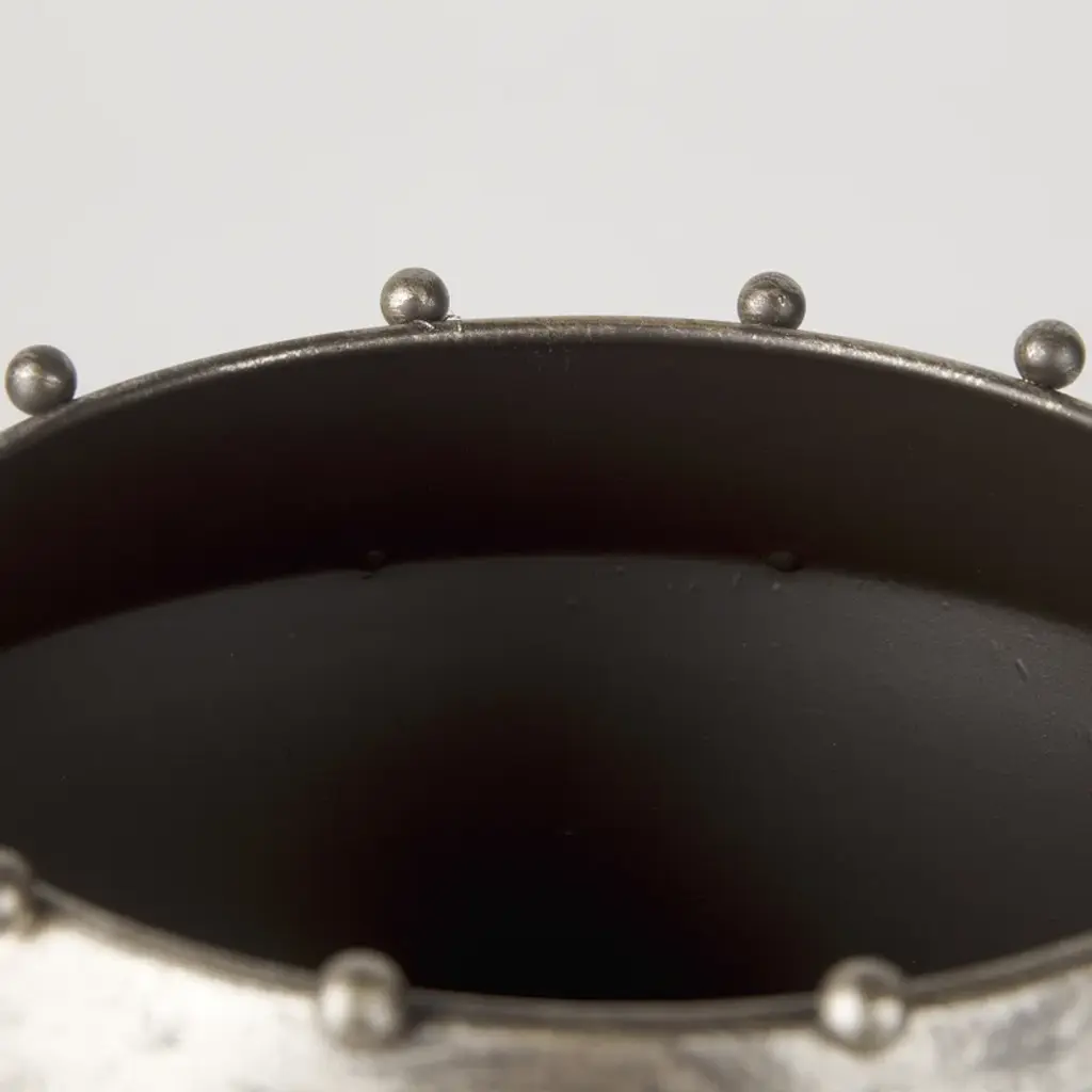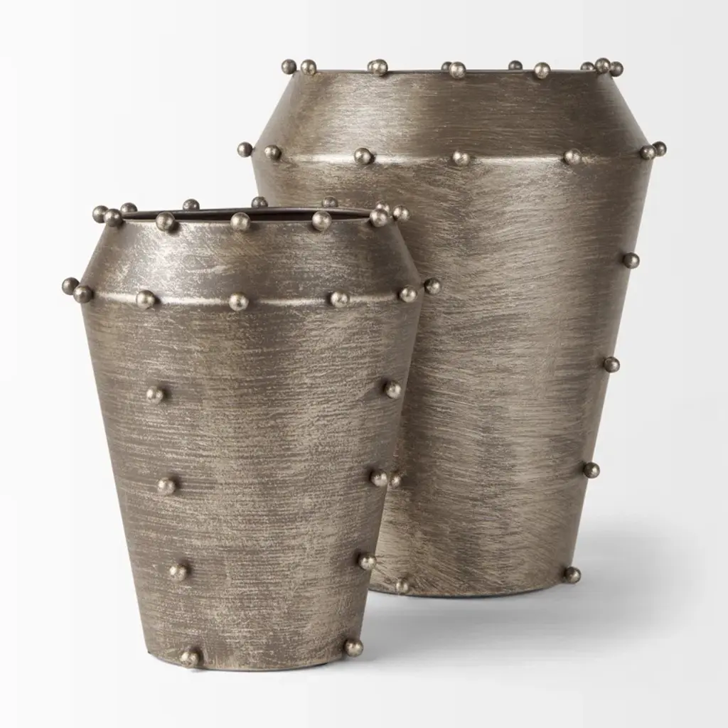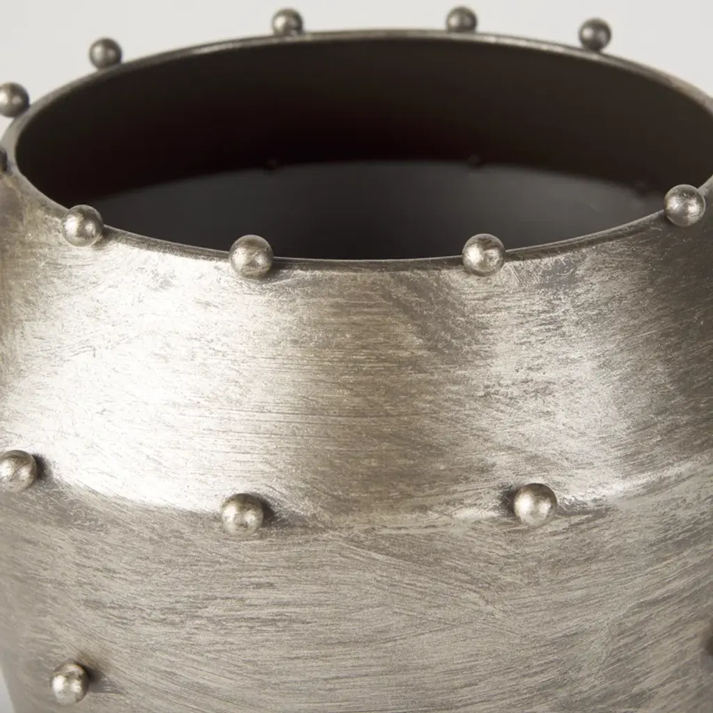The vase measures: 9.8L x 9.8W x 12.2H. The vase is crafted from high-quality metal, making it a sturdy and durable piece. This unique vase is finished in a champagne, tone, and features interesting metal studs running down the sides, and around the opening. Featuring an all-metal construction, metallic tone, and unique studding, this piece fits in perfectly with an industrial design style.