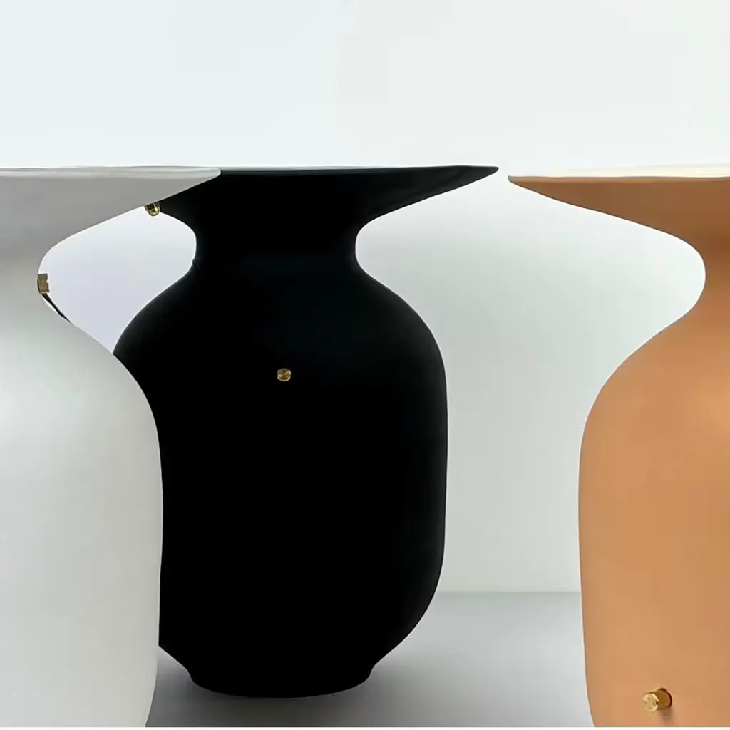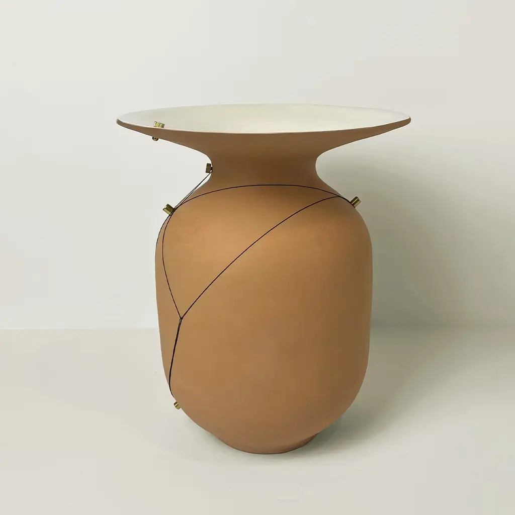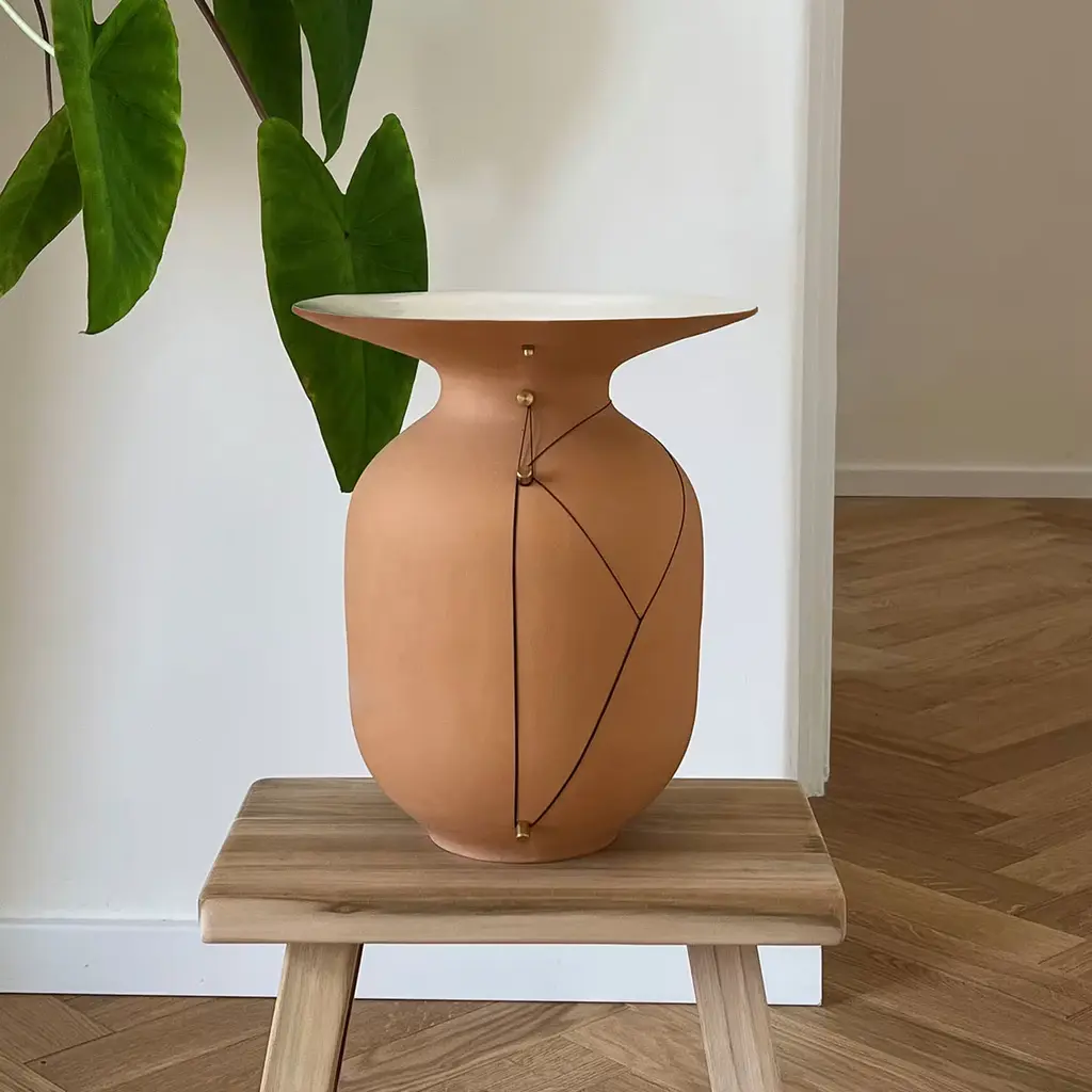 Named after the Italian word for 'temporary', this collection draws inspiration from the concept of ever-changing situations and our capacity to find solutions within them. Showcasing vibrant threads moving across steep surfaces, it is meticulously handcrafted, rendered in a matte beige exterior that is internally lighter and impeccably polished.