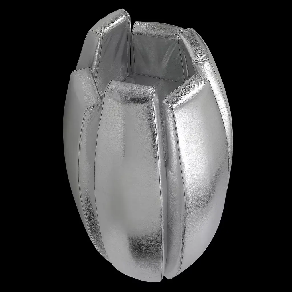 This striking decorative vase exudes an exclusive modern style, distinguished by a mesmerizing silver upholstery available in fabric, leather, or faux leather. Perfect for both indoor and outdoor decors of private and contract nature, it is handcrafted of plywood and padded with polyester sheets. Please contact the Concierge for further details.