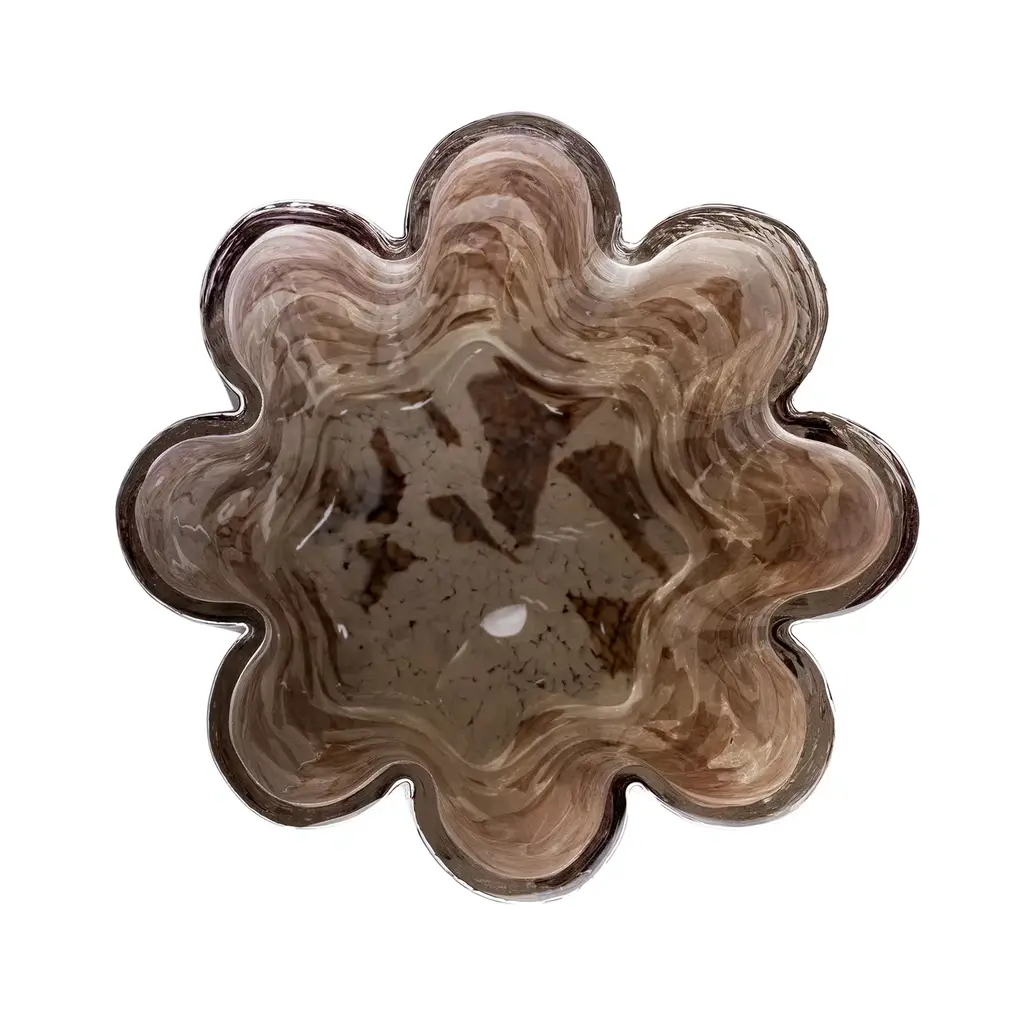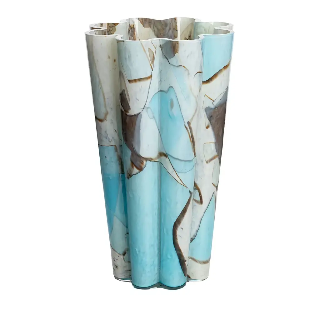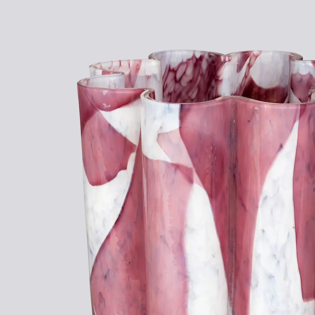 The bucket vase showcases a distinctive, blooming flower silhouette enhanced by a striking fusion of purple and white hues. Its sculptural petal-like edges create dynamic visual depth, while the bold color pattern adds vibrancy to any interior setting. Ideal for contemporary or eclectic decor, this substantial piece serves as a refined focal point, elevating living rooms, dining areas, or office spaces with its artistic presence. Every piece is unique, due to handcrafting slight changes may occur.