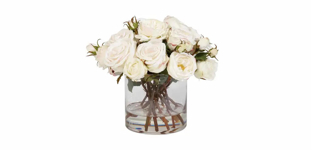 Nothing says "love" quite like a rose in full bloom. And this stunning recreation captures a bouquet of roses, with lush, pouty blooms that sit regally on a backdrop of green leaves. This magnificent arrangement is then housed in a decorative glass vase, complete with Liquid Illusion faux water. There is no substitute for a rose, and there's no better way to capture that feeling than with this arrangement.