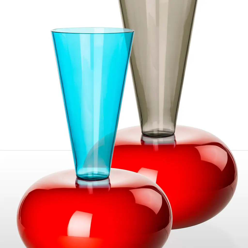 Part of a numbered collection of pieces designed by Ettore Sottsass , this vase is fashioned of mouth-blown glass. The smoky-gray, cone-shaped mouth and neck and the red, oval-shaped body are crafted using the opaline technique, whereby layers of clear glass are superimposed atop opaque glass.