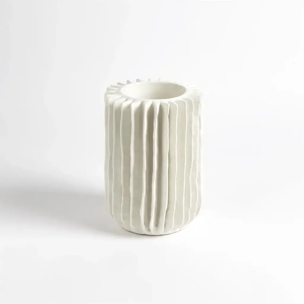 Liner organic fins surround the Radiator Swirl Vase adding a sculptural element to the Italian ceramic vase. Available in matte white in two sizes. From a fashion forward perspective, Global Views offers accessories, furniture, statement lighting, and an assortment of rugs and mirrors to add beauty and joy to your home.