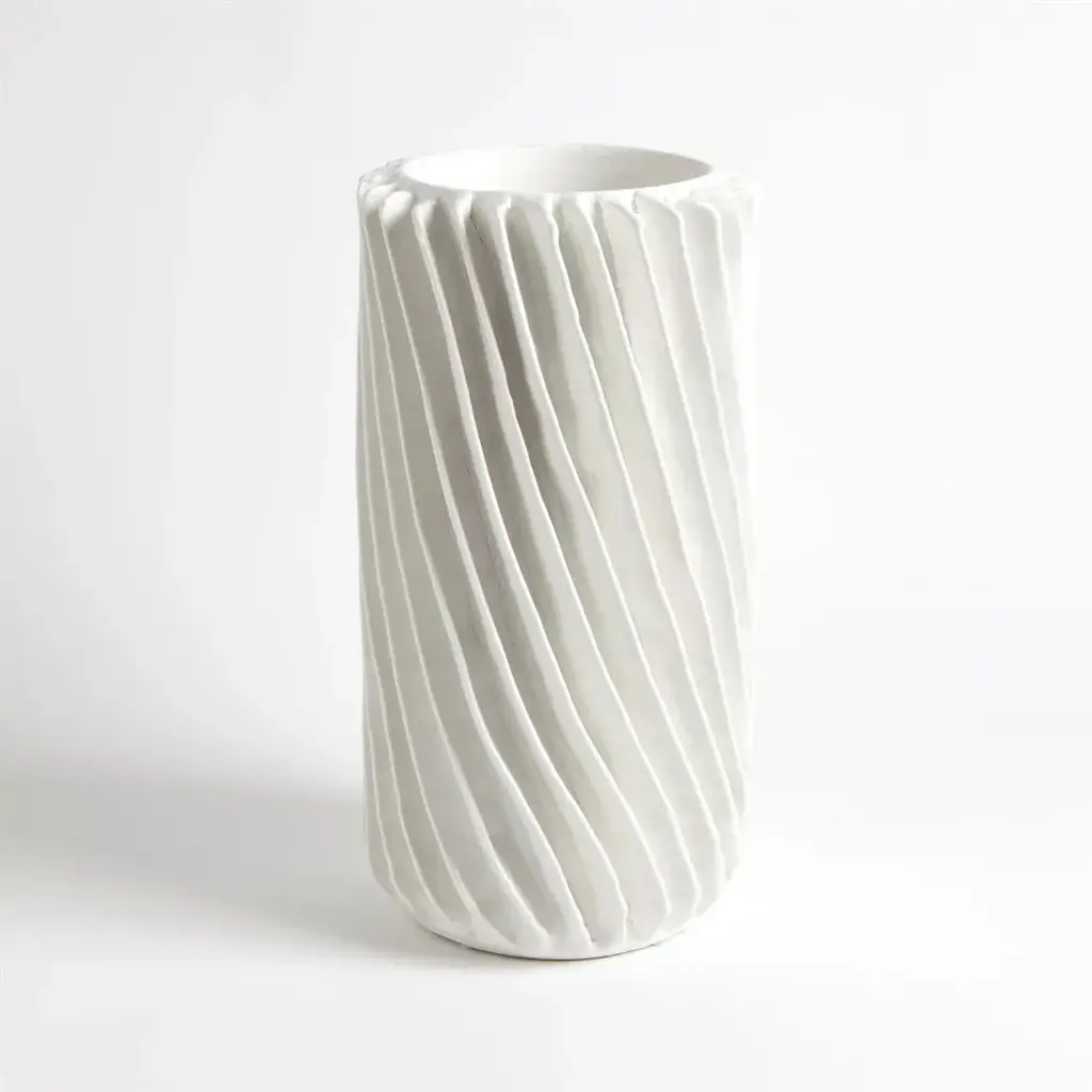 Liner organic fins surround the Radiator Swirl Vase adding a sculptural element to the Italian ceramic vase. Available in matte white in two sizes. From a fashion forward perspective, Global Views offers accessories, furniture, statement lighting, and an assortment of rugs and mirrors to add beauty and joy to your home.
