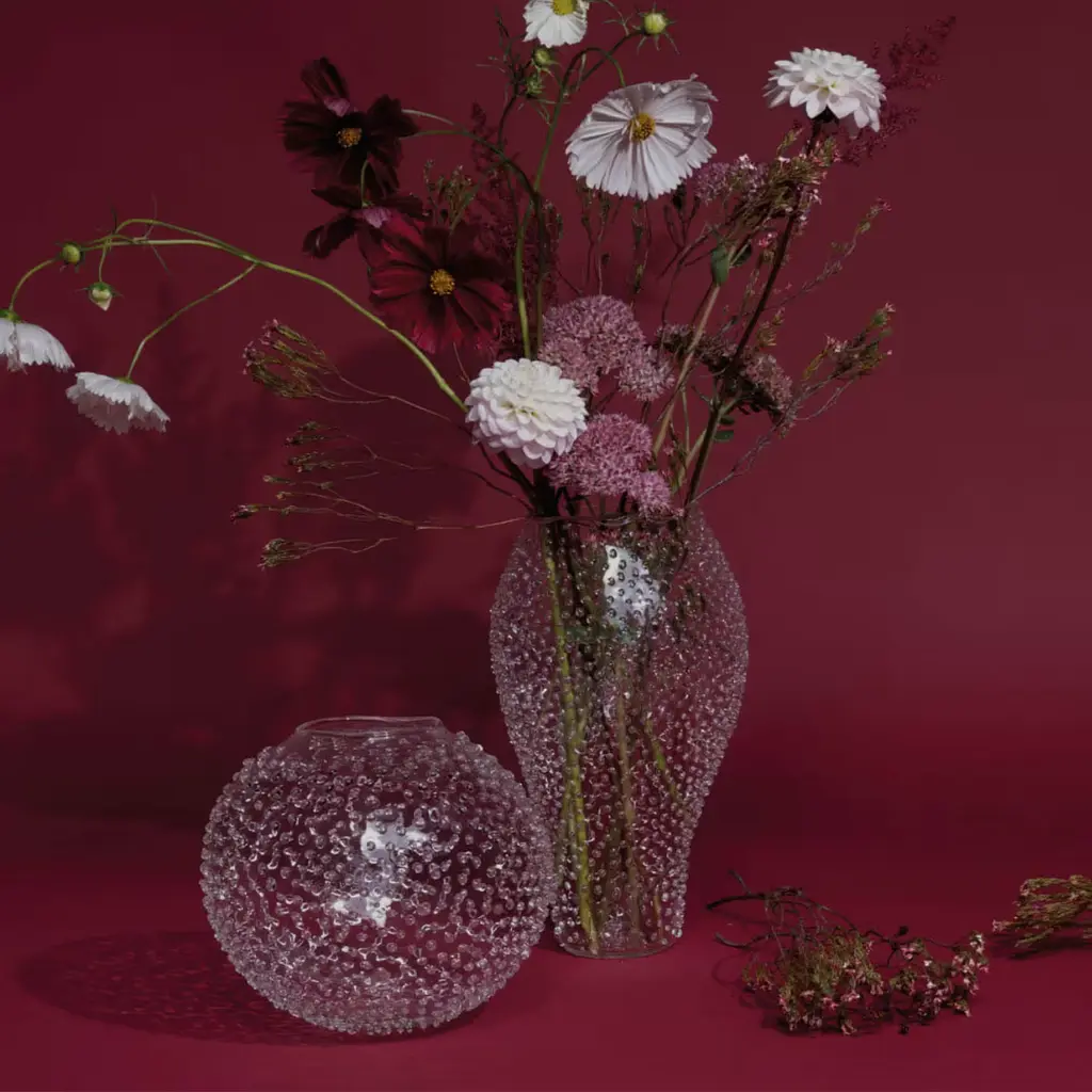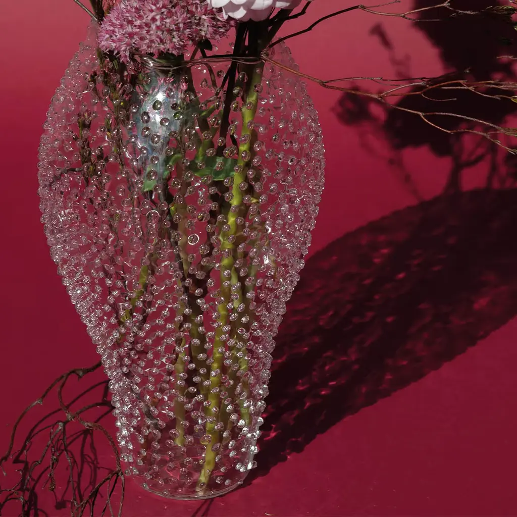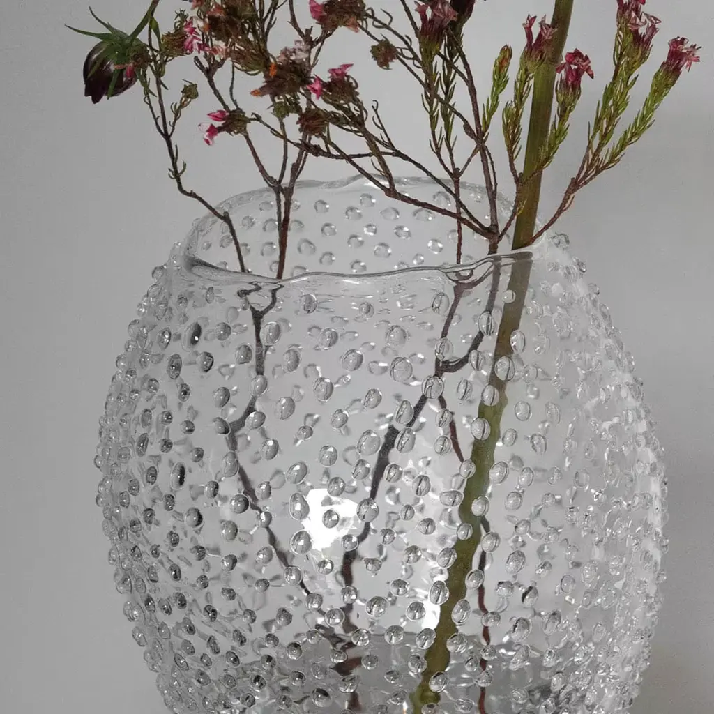 The Rainy Vase embodies the essence of open-air living, with its organic silhouette and delicate rain effect. Adorned with droplets that capture and reflect light like diamonds, it exudes elegance and refinement. Each droplet is meticulously applied by hand, taking around 3 hours to create a unique, random pattern. Crafted with precision, it symbolizes water and adds a touch of artistry and sophistication to any space.