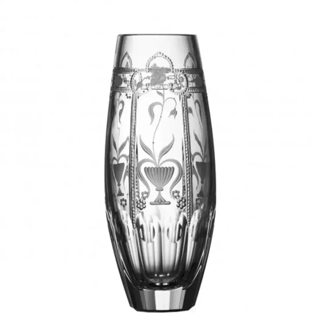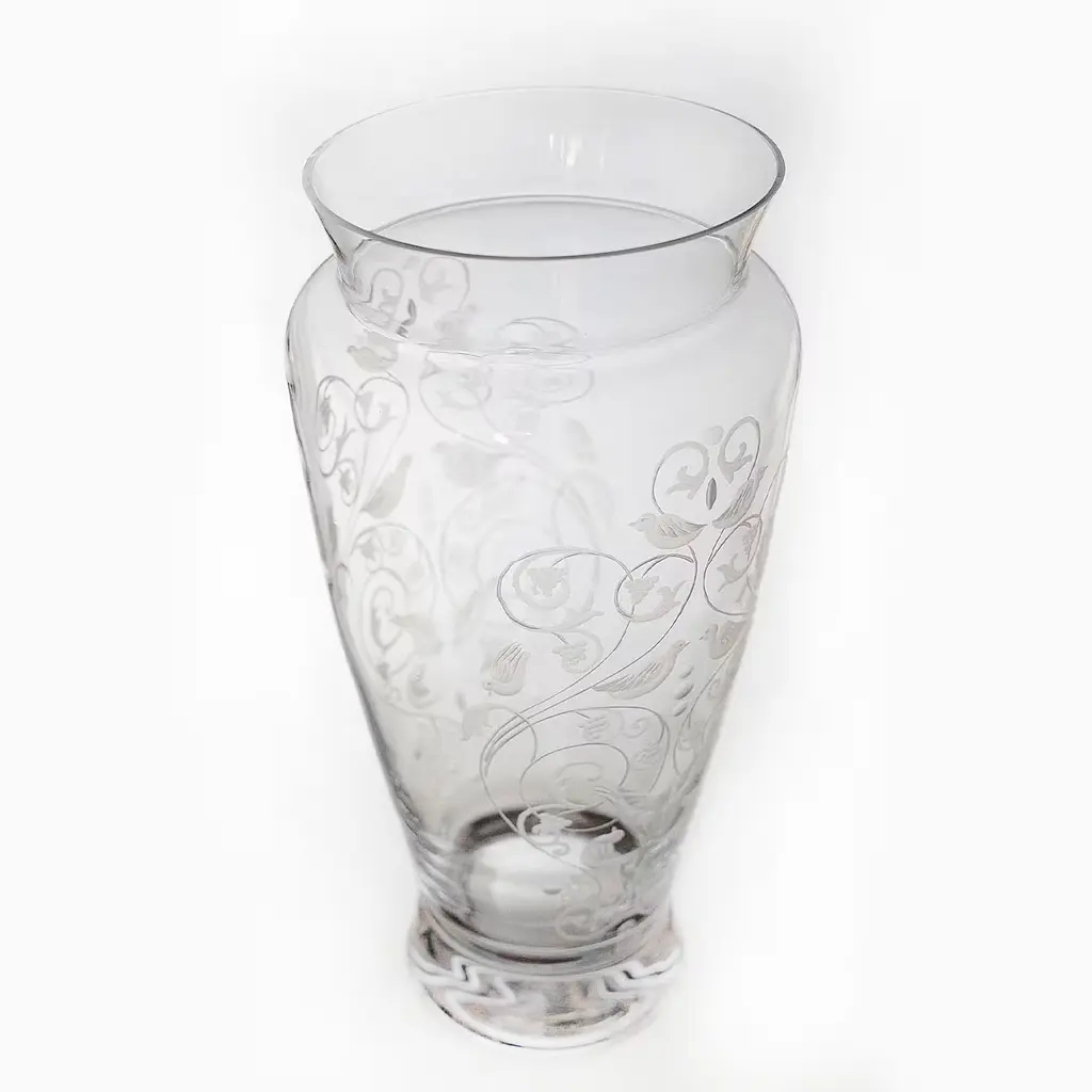 Clear blown glass vase and hand-engraved from a stone wheel with a pattern of ramages with small grapples, birds, leaves and scrolls filling the vase's surface. Appropriate for usage but also for adorning a space.