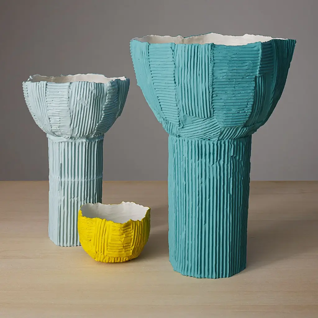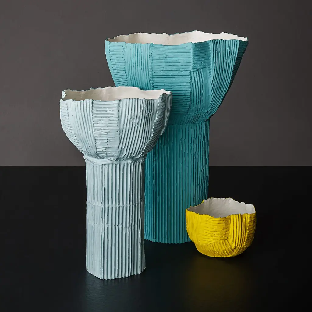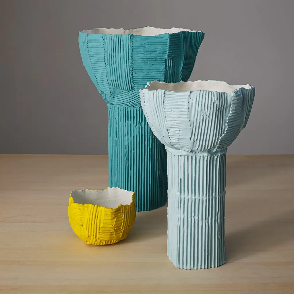 Inspired by the shapes of nature the new collection of paper clay objects was created by Paola Paronetto. The image of buttercups, with their generous crowns and dancing stems, suggests small daring structures and imaginative balances that acknowledge, as always in Paola's work, imperfections, asymmetries, and irregularities. As thin as paper, yet full-bodied and sculptural, they are born of alchemies that are impossible to replicate, so that each has its own soul and story.