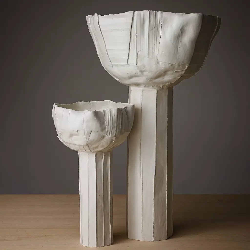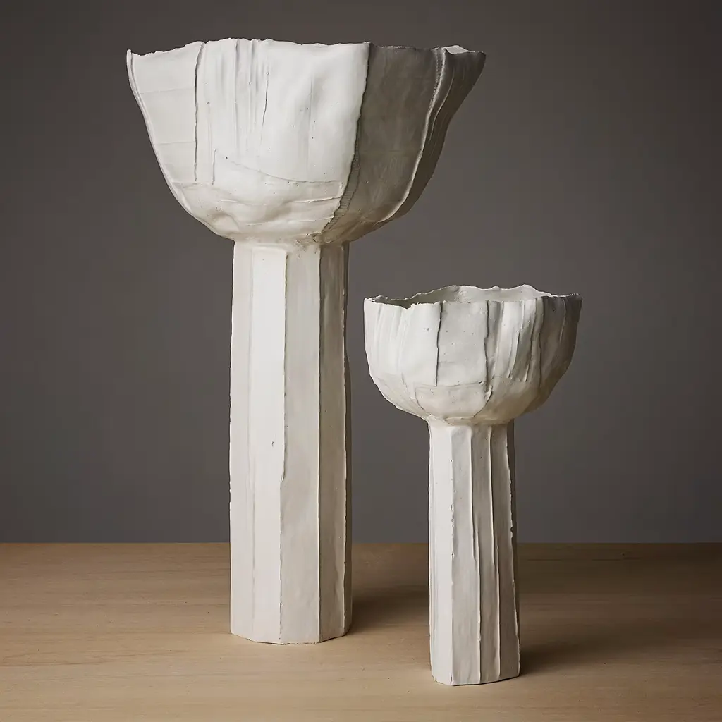 Inspired by the shapes of nature the new collection of paper clay objects was created by Paola Paronetto. The image of buttercups, with their generous crowns and dancing stems, suggests small daring structures and imaginative balances that acknowledge, as always in Paola's work, imperfections, asymmetries, and irregularities. As thin as paper, yet full-bodied and sculptural, they are born of alchemies that are impossible to replicate, so that each has its own soul and story.