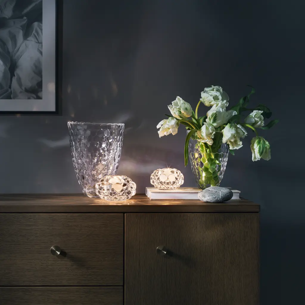 Elevate your home decor with the Raspberry Vase from Orrefors. This classic piece features a soft and delicate design, reminiscent of a raspberry with its drupelets. Made of clear crystal and designed by Anne Nilsson, it's perfect for displaying short stem flowers or as a standalone decorative object. Highlights