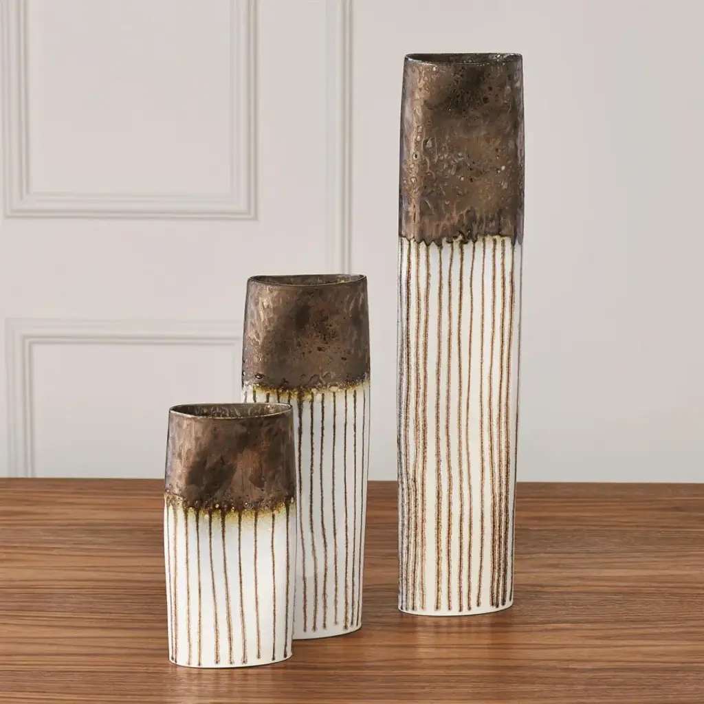 Slip molded Portuguese porcelain in the form of elongated ovals - with "pinched" waists. Glazed in a reactive bronze, which "drips" down the body of the vase. Available in 3 sizes. From a fashion forward perspective, Global Views offers accessories, furniture, statement lighting, and an assortment of rugs and mirrors to add beauty and joy to your home.