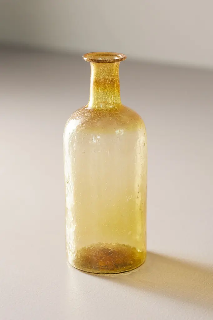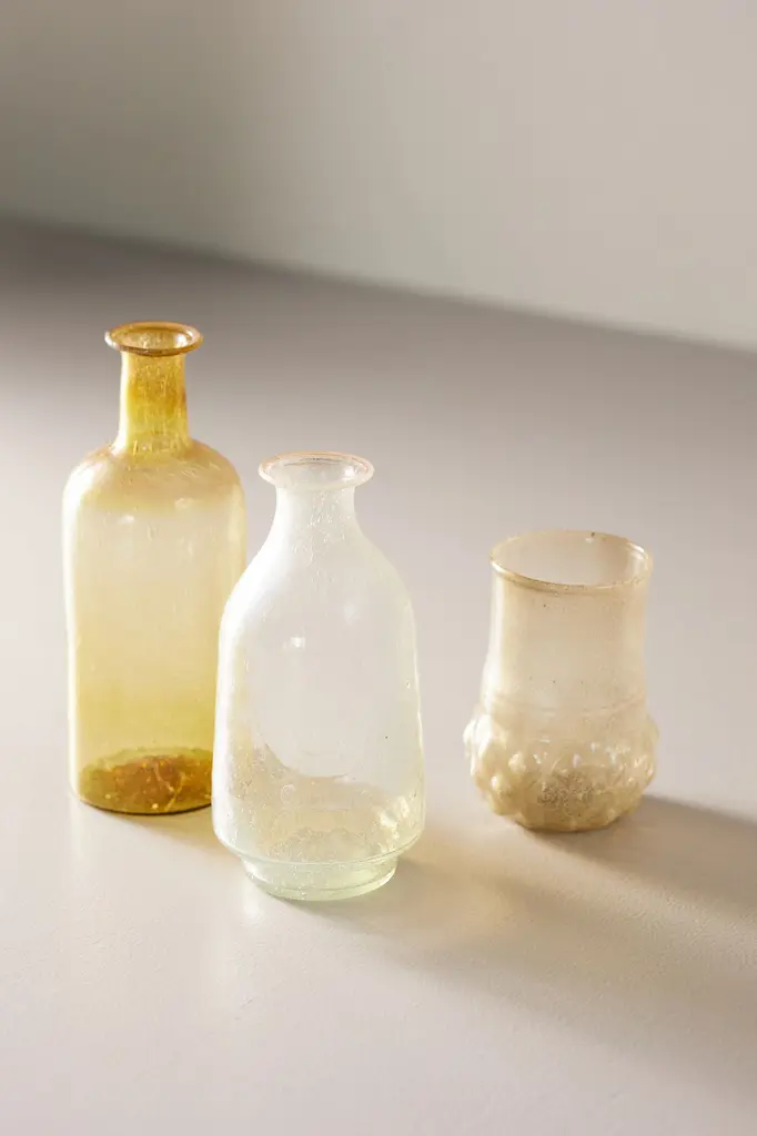 Crafted from recycled glass in a range of complementary hues, this set of three bud vases is a modern addition to the mantel, entry table, or decorative shelf. Perfect for petite fresh cuts or preserved stems.