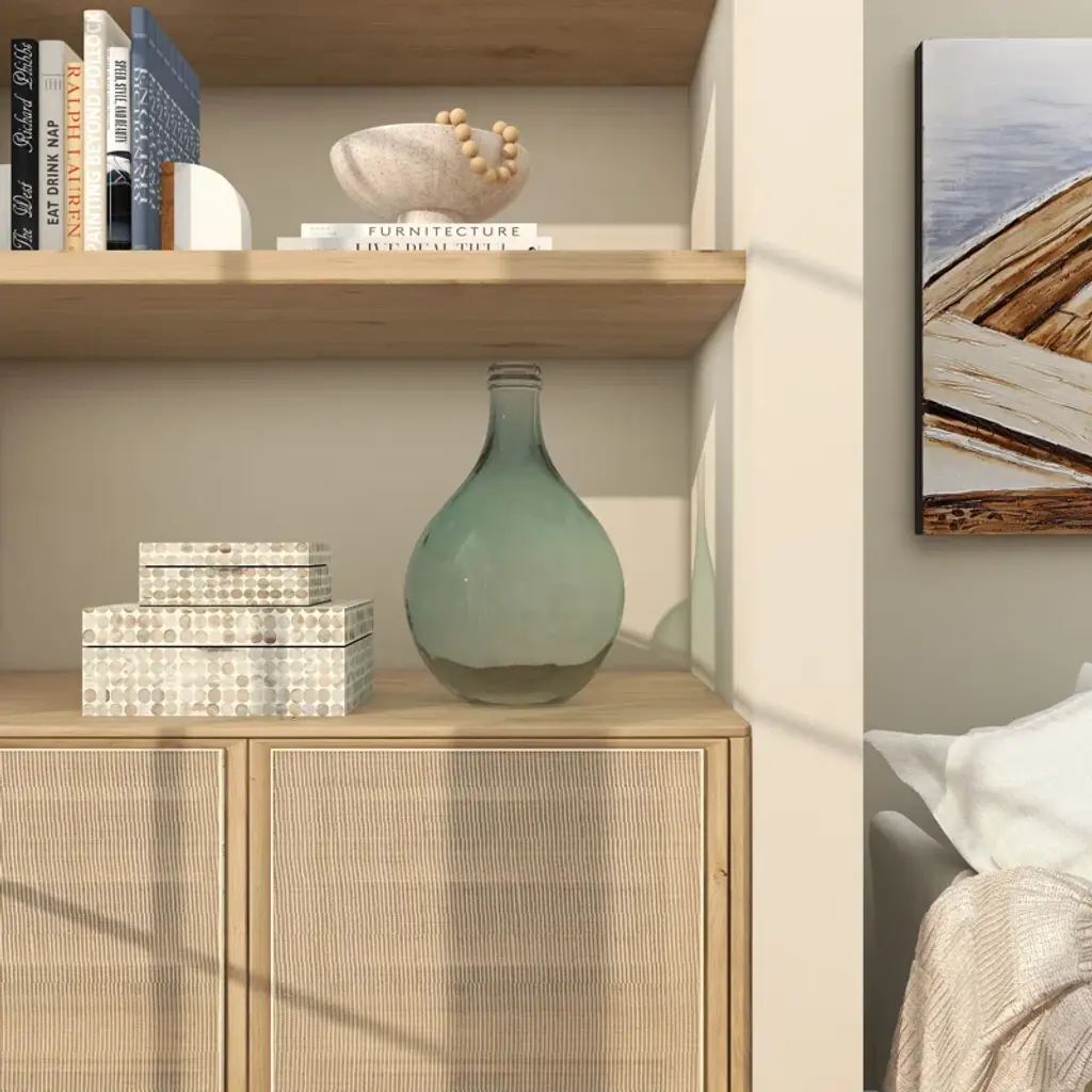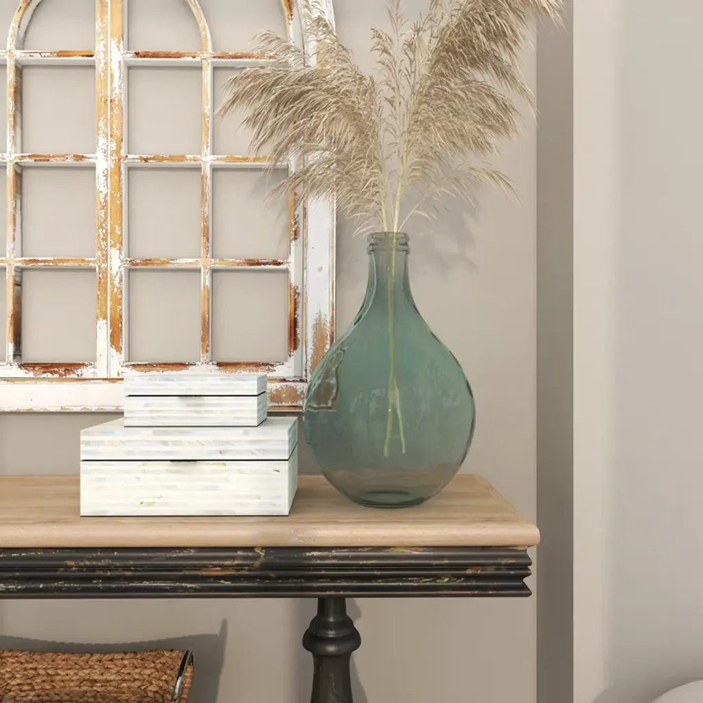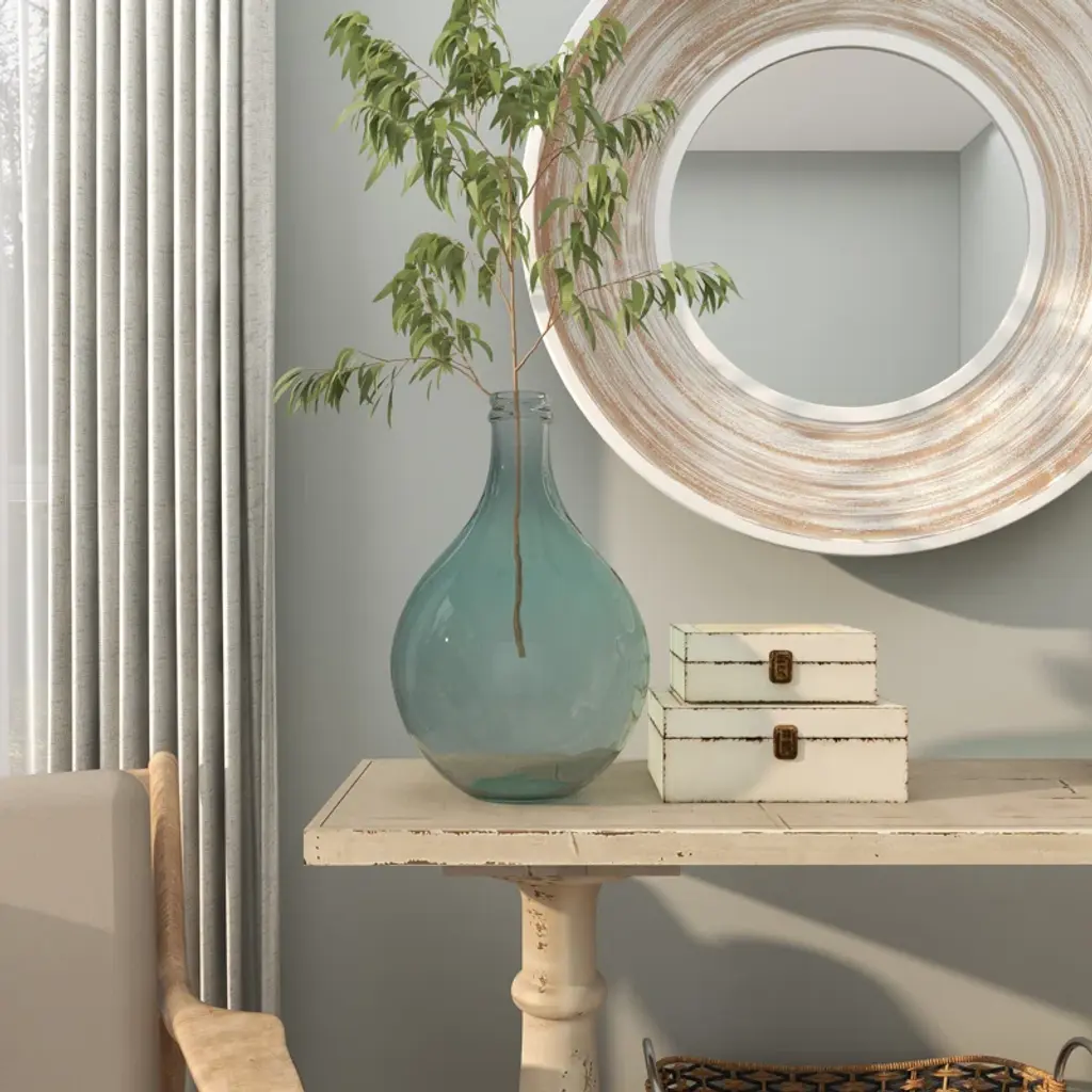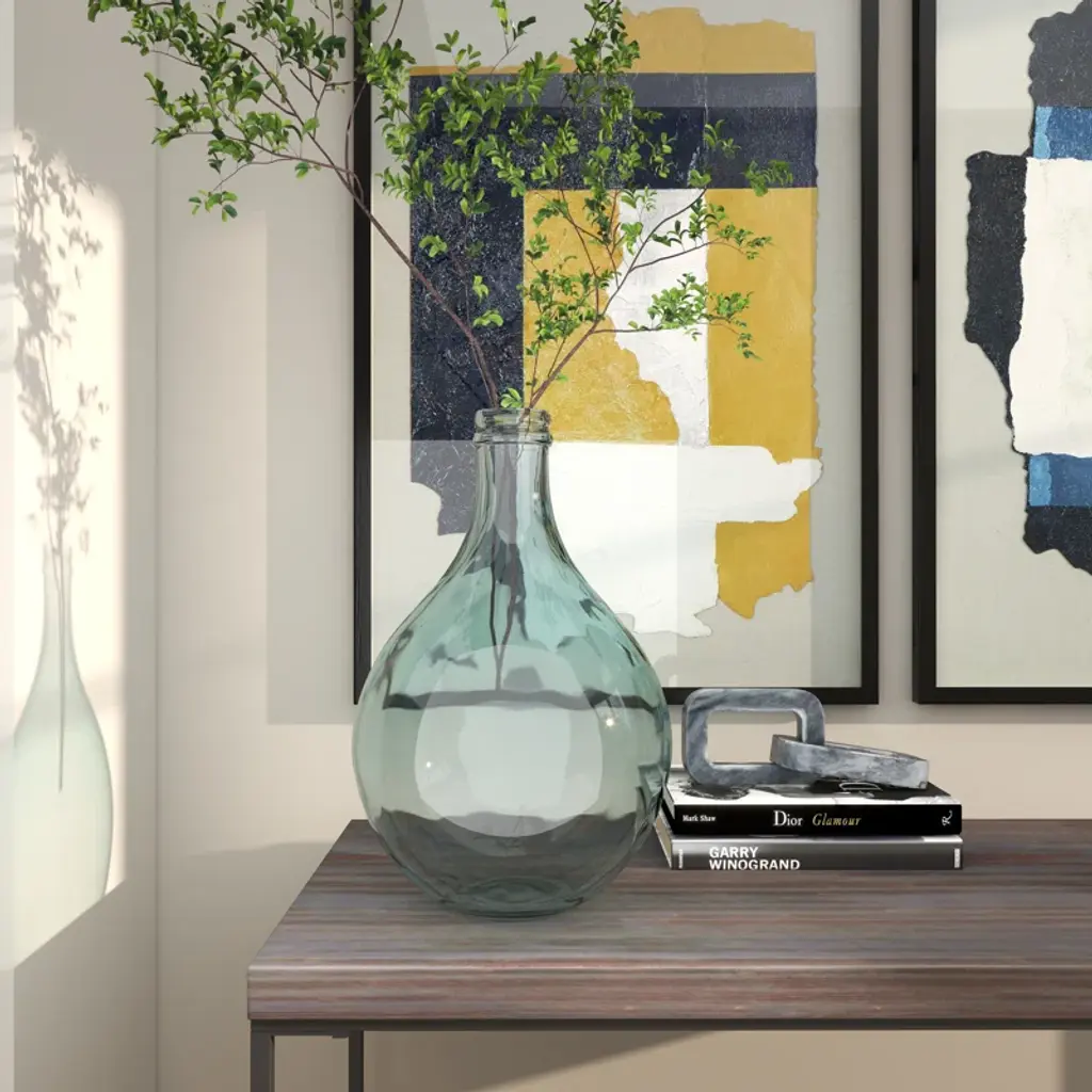 This vase is perfect for displaying orbs filler and twigs, as well as filling up any negative space against an open surface space. Whether in your kitchen or on your coffee table, it's a great way to display and store your favorite things. This clear aquamarine glass vase carries a crisp and clean minimalist coastal vibe reminiscent of the ocean, display it with jute rope decor, seashells, and sand to complement its design concept. This item ships in 1 carton. Suitable for indoor use only. This item ships fully assembled in one piece. Made in Spain. This is a single-tinted colored vase. Modern style. The vase has a 1.5-inch mouth opening.