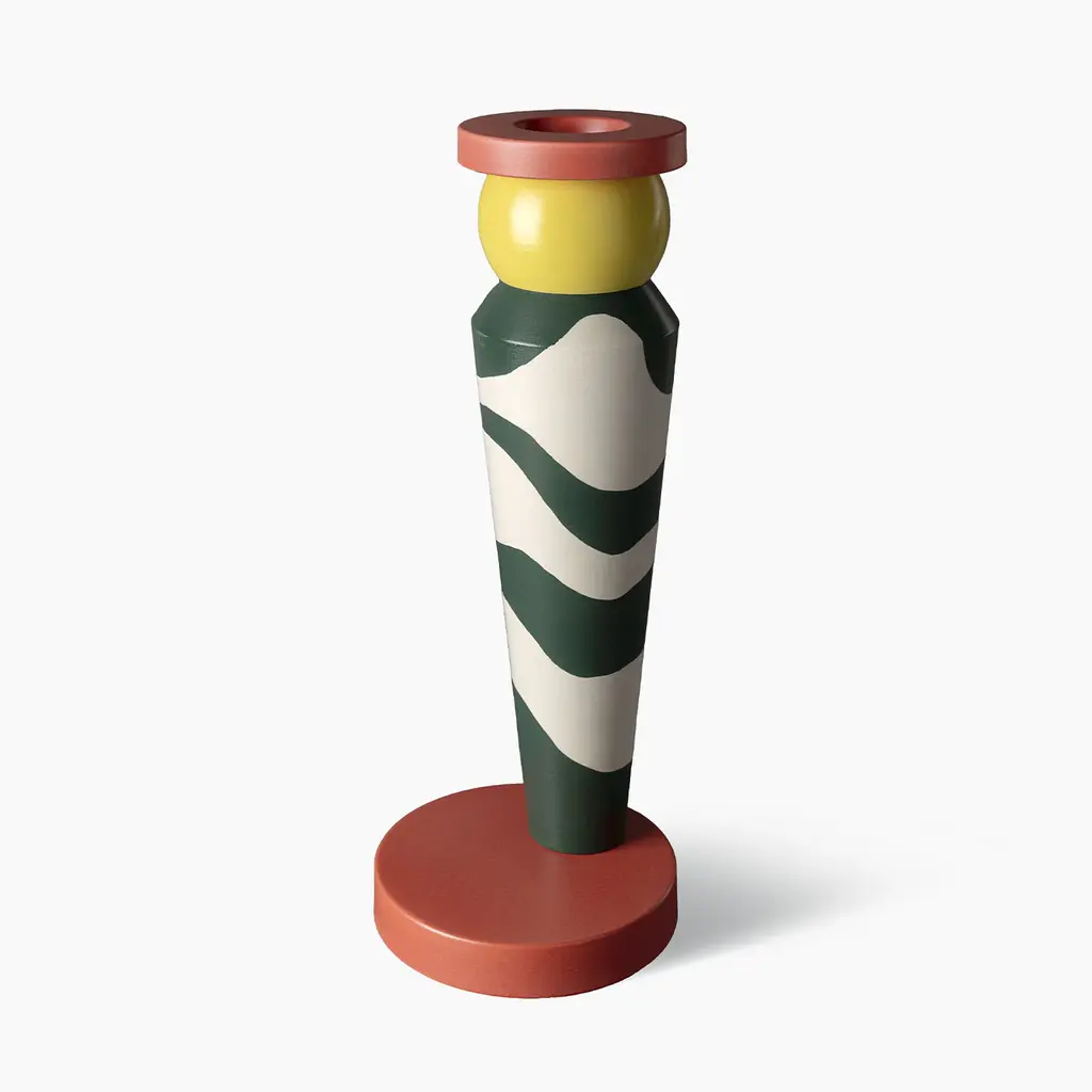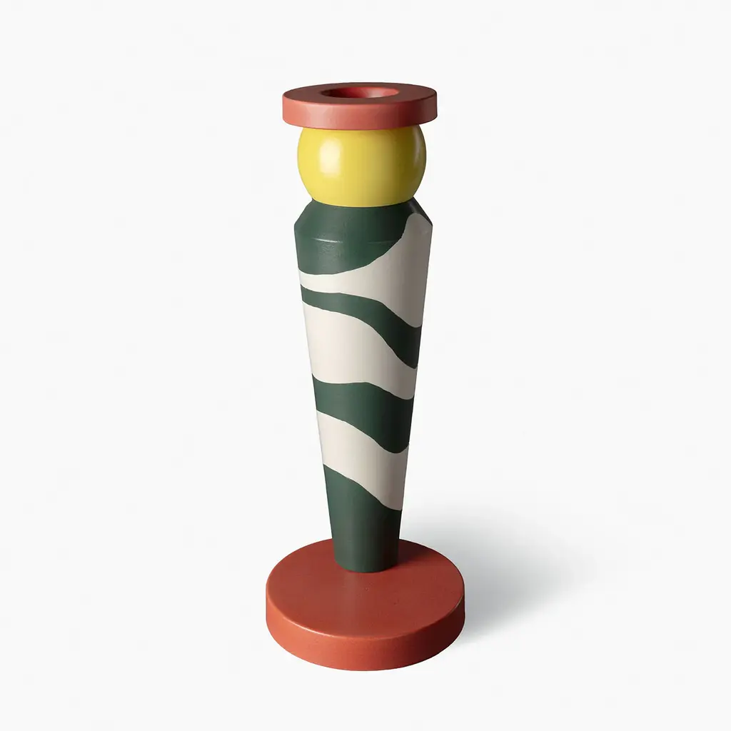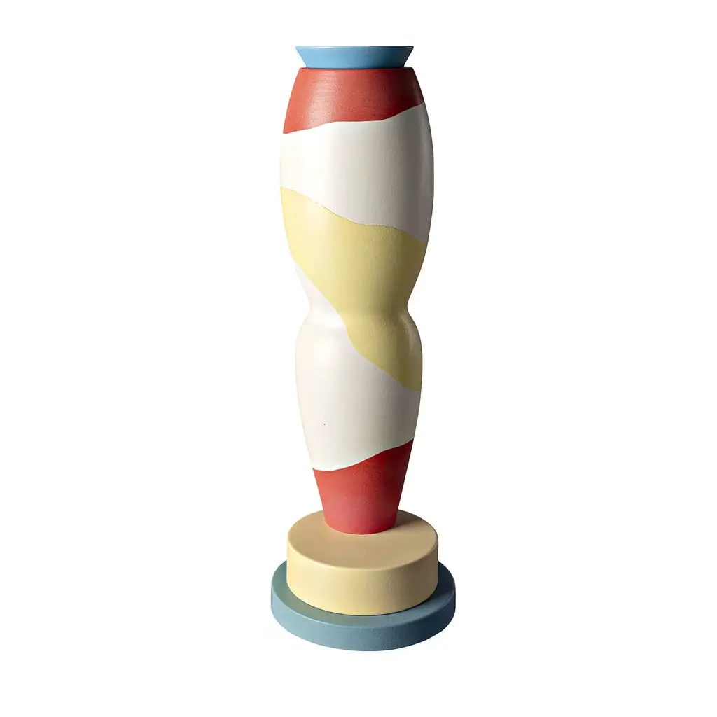 This geometric vase is in white clay and consists of four pieces resting one on top of the other. Two round, red parts make the base and mouth of the piece, while the body is a black and white upside-down conic shape with a yellow sphere on top. This striking piece was designed in 2005 for Bitossi by George J. Sowden as part of a limited series of 299 objects.