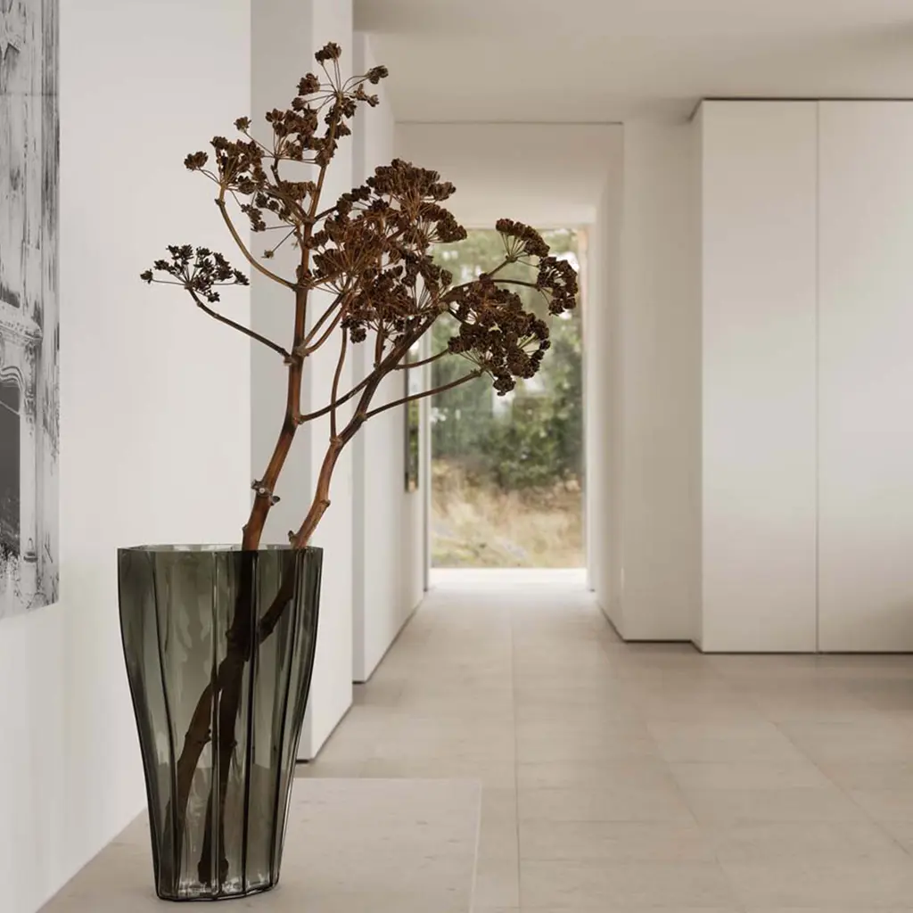 With Reed, Swedish designer Monica Förster shows how to create a sense of organic movement by emphasizing folds. A quiet sway in the solid, clear glass. The low Reed vase is well-suited for tulips. The medium-size Reed is suitable for hand-picked florals and cut flowers.
