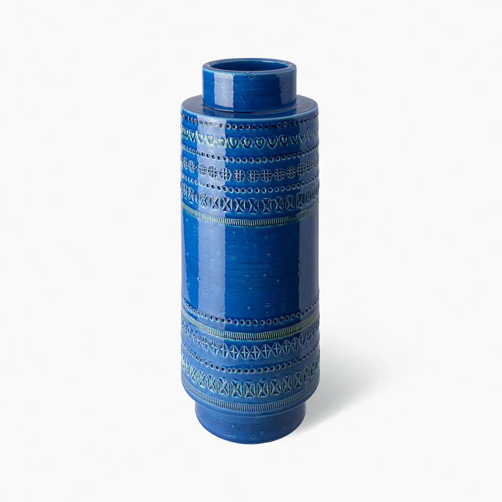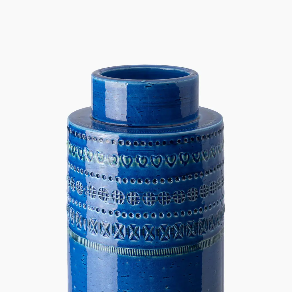 This exquisite small vase is in white clay with a striking turquoise finish. Its rectangular shape with a smaller base and top evokes the shape of a reel and features a series of parallel geometric carvings running all around its central body. This piece was designed by Aldo Londi in 1953, when he was artistic director of Bitossi.
